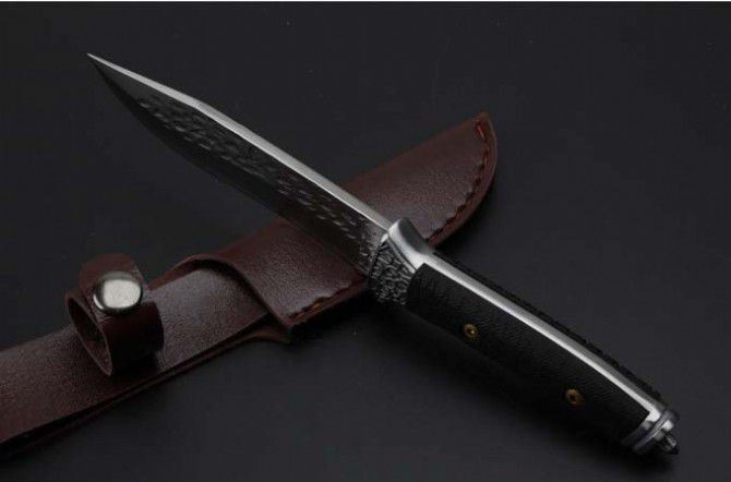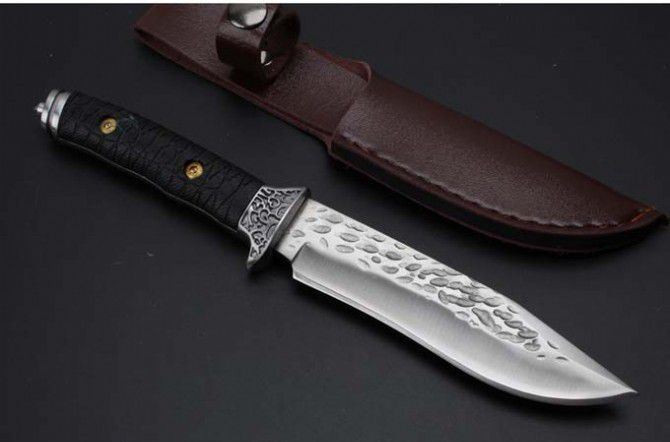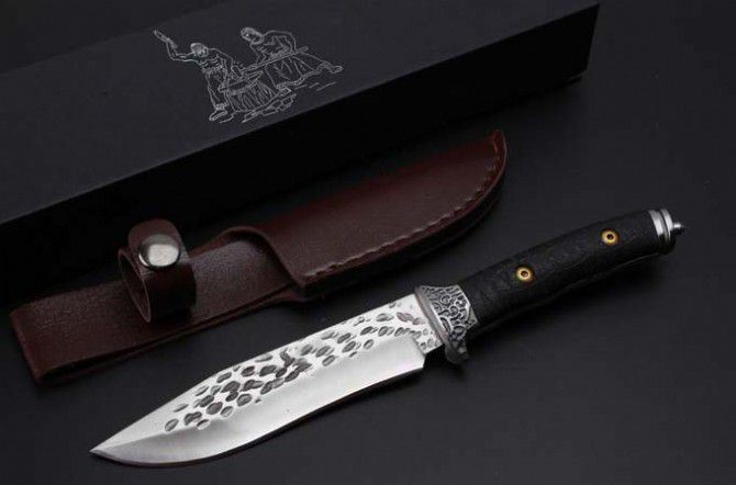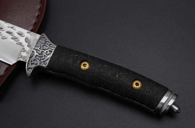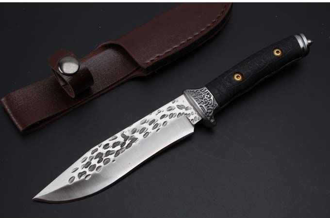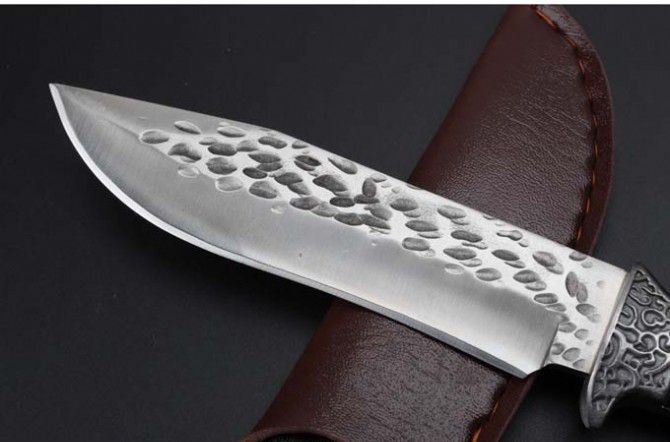 大号金美锻打手工刀 全 长:240mm 刃 长:128mm 柄 长:110mm 刃 宽:29mm 刃 厚:5.0mm 刃 材:7Cr13Wov(汽车弹簧钢手工锻打) 重 量:352g(含包装) 硬 度:58HRC 表 面:钢本色 柄 材:白钢头+G10 其 他:配皮套和礼品盒