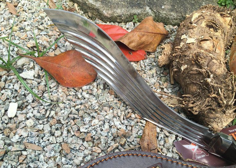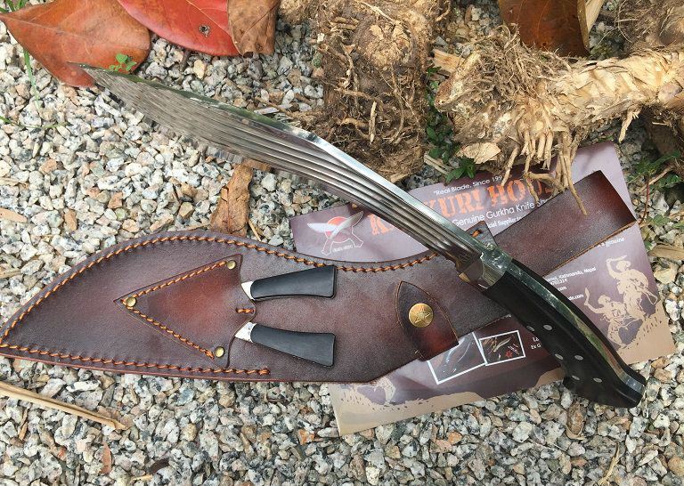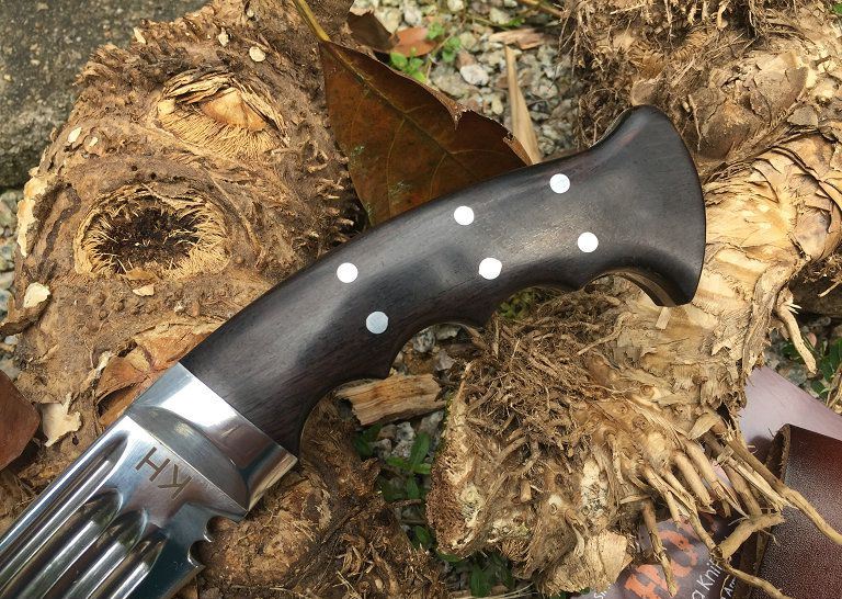 新版廓尔喀大血刃手工狗腿弯刀 全长:41.5cm 刃长:29cm 柄长:12.5cm 厚度:6.0mm 硬度:60+- 钢材:9CR18MOV (锻打) 柄材:黑檀木 表面:超镜光(一体龙骨) 重量:598g 刀鞘:牛皮刀鞘 廓尔喀刀(又称尼泊尔军刀)此刀全手工制作一体龙骨,不要拿普通的弯刀来对比(老鼠尾手柄)不是一个档次的,我们秉承“高质优品”之宗旨,在选料时不惜成本,制作时精益求精,每一把都精品