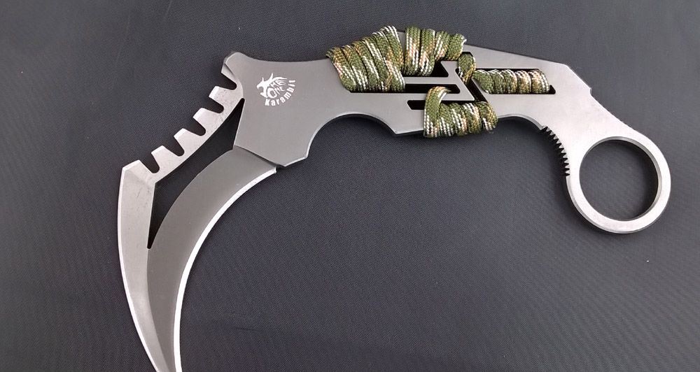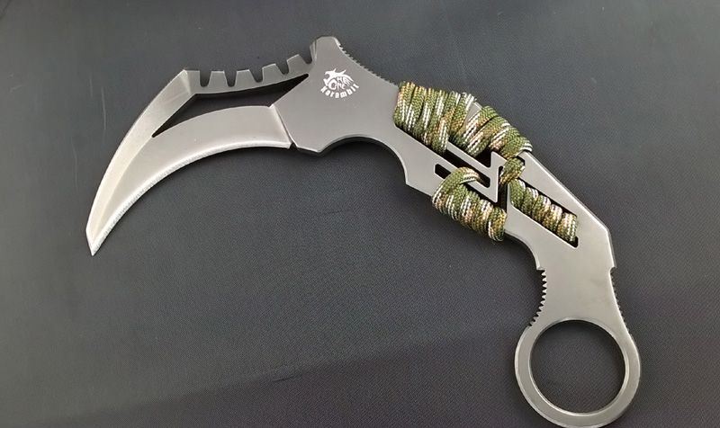 THE ONE 末日IV karambit爪刀(绳柄) 全长: 16.8CM 刃长: 9CM 柄长: 11.5CM 刃厚: 0.5CM 刃材料: AUS-8 硬度: 59 表面: 枪灰钛 重量: 250克(带鞘) 净重: 150克