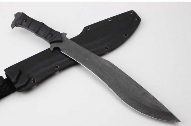 僵尸工坊怒汉战术砍刀 全 长:448mm 刃 长:300mm 柄 长:140mm 刃 宽:50mm 刃 厚:4.9mm 刃 材:9Cr18Mov 重 量:827g(含包装) 硬 度:58HRC 表 面:腐蚀纹 柄 材:一体钢+G10 锁 型:定锁 其 他:硬纸盒+K鞘 可削纸 劈砍穿刺