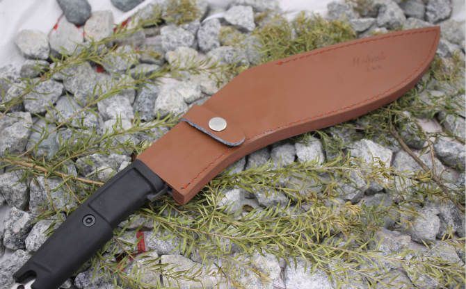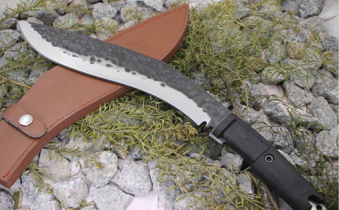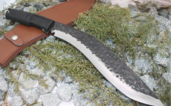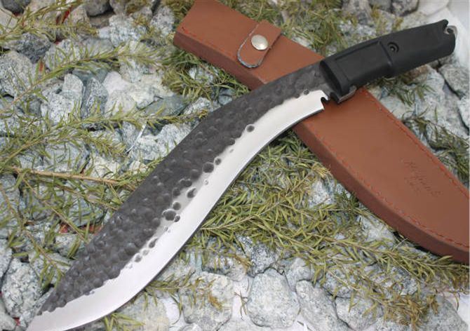 加长款锻打尼泊尔战龙狗腿刀 全长:43cm 刀刃:29cm 刃厚:0.6cm 刃宽:5.3CM 柄长:12.5cm 柄材:橡胶 硬度:57HRC 毛重:990克(含皮套) 表面处理:纯手工锻造
