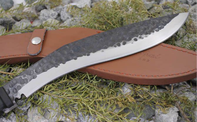 加长款锻打尼泊尔战龙狗腿刀 全长:43cm 刀刃:29cm 刃厚:0.6cm 刃宽:5.3CM 柄长:12.5cm 柄材:橡胶 硬度:57HRC 毛重:990克(含皮套) 表面处理:纯手工锻造 结构:龙骨结构,刀身贯穿刀柄,非常牢固 、皮鞘、纸盒