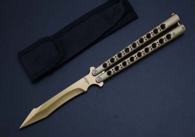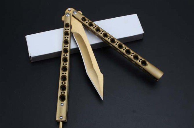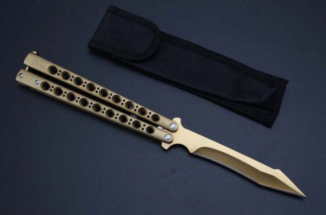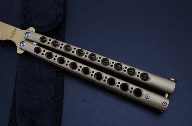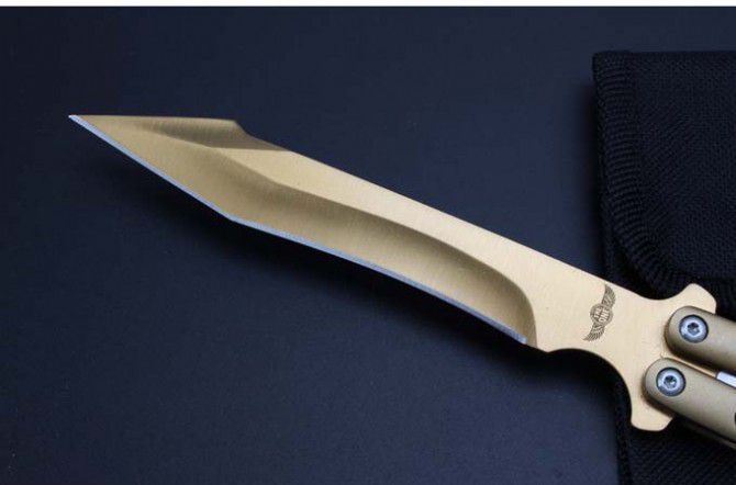 the one九孔猛禽甩刀蝴蝶刀(黄金版) 全长:29CM 刃长:13.5CM 刃厚:0.3CM 刃材料:440C 刃硬度:58 柄材料:不锈钢压铸 柄硬度:40 重量:200克 THE ONE 九孔猛禽甩刀,由The one (唯一)精工打造,是现成BM系列变异款式,刃型奇特,如同猛禽的长喙,非常凶悍!29CM超长款式, 更坚固和耐摔,转动灵活,由THE ONE 出品,不可多得的精品甩刀!