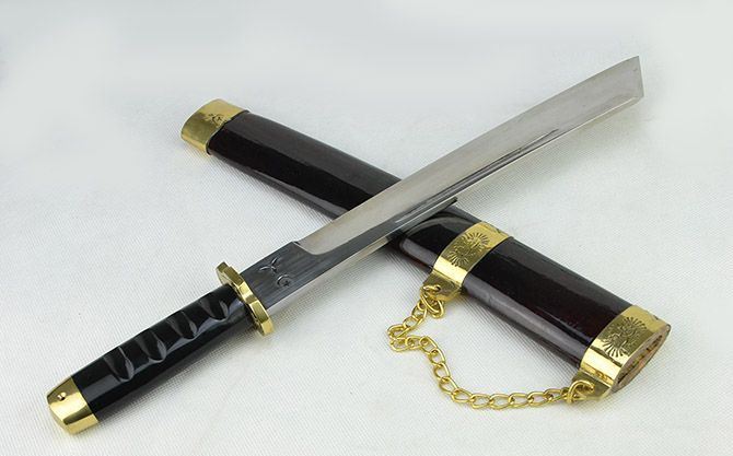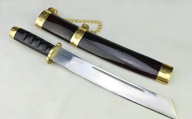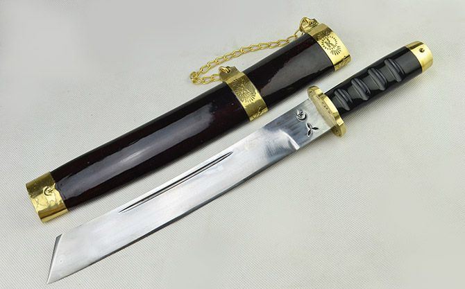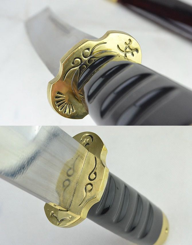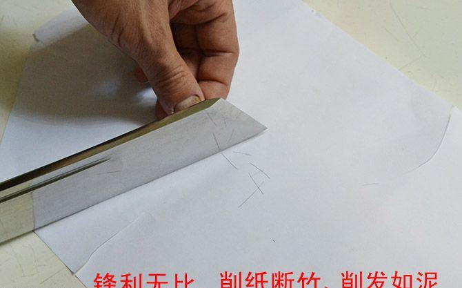 户撒天门斩(纯手工打造) 全长:44cm 刃长:31cm 刃宽:3.8cm 刃厚:0.75cm 刃材:弹簧钢 柄长: 12cm 重量:920克(含鞘) 鞘材:红木 装材:包铜 柄材:双铜头+黑牛角 硬度区间:60HRC 性能:手工精细研磨全开锋,削纸断竹、削发如泥、锋利无比。 备注:手工产品存在误差,规格仅供参考,请以实物为准!
