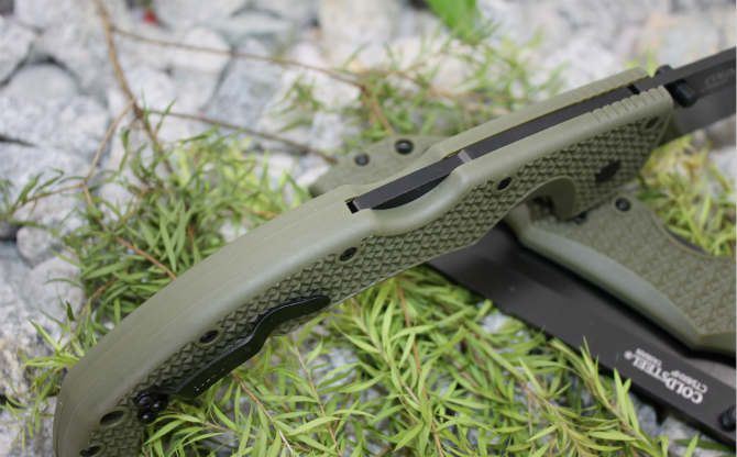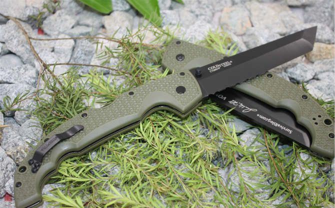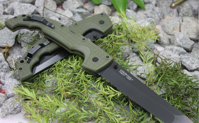 冷钢COLD大折刀海航家绿柄黑色直刃方头(全刃、半齿) 全长:31.5cm 刃长:13.5 柄长:18cm 刃厚:0.4cm 刃宽:3.4cm 刃材:8CR13MOV 柄材:尼龙纤维 硬度:56-57HRC 净重:285克 (含包装) 锁定:背锁 表面处:黑色刃