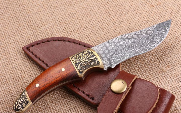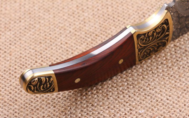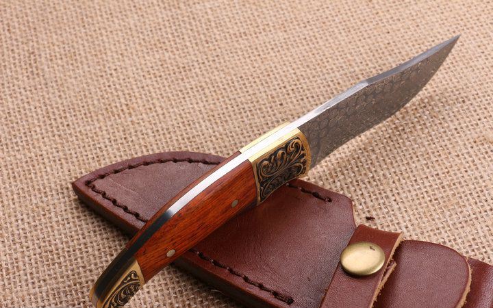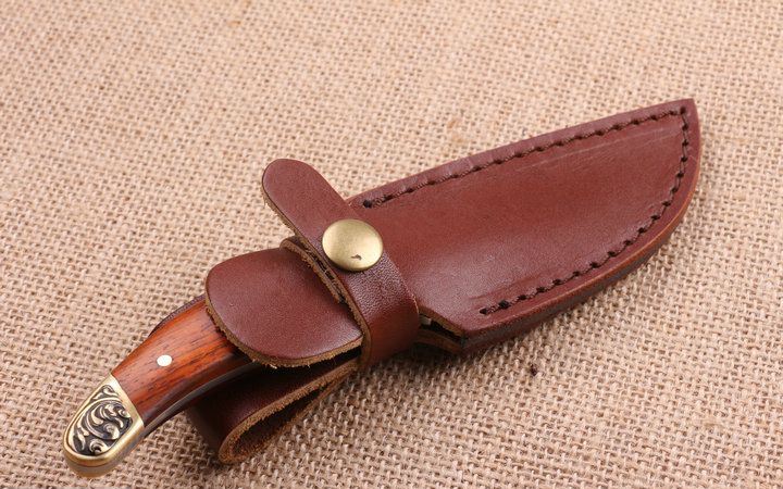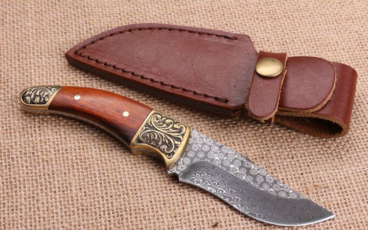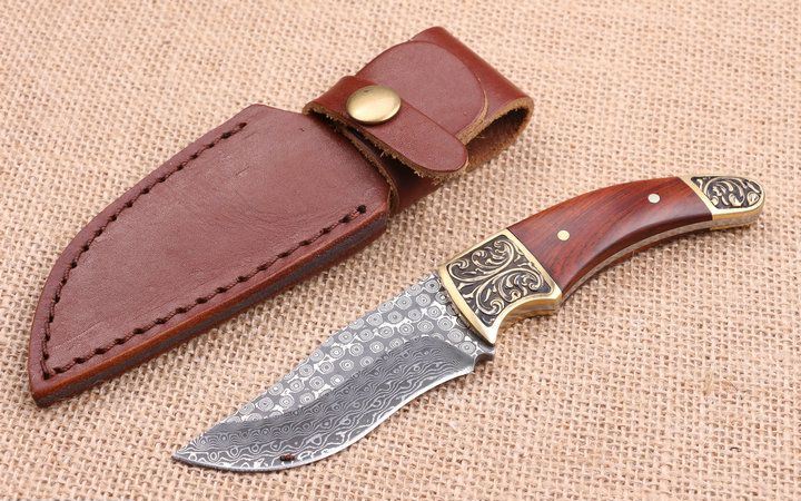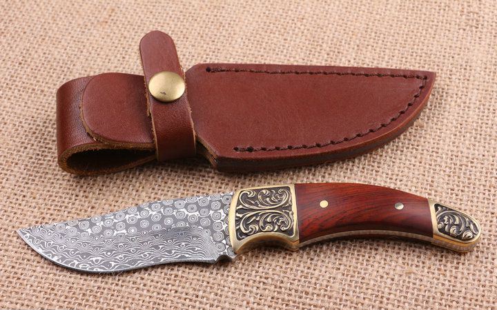 玟瑰纹大马士革钢小猎刀 全 长:18.0Cm 刃 长;8.2Cm 柄 长:9.5Cm 刃 宽:2.8Cm 刃 厚:3.2mm 刃 材:一体龙骨大马士革钢,绝对100%没焊接。 重 量:250g (含包装) 硬 度:58-60HRC 表 面:原大马士革纹 柄 材:雕花铜头+红檀柄,木纹纹路清楚 锁 型:无锁