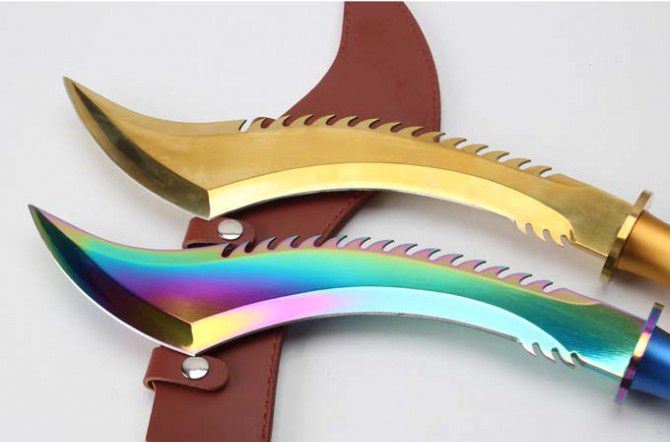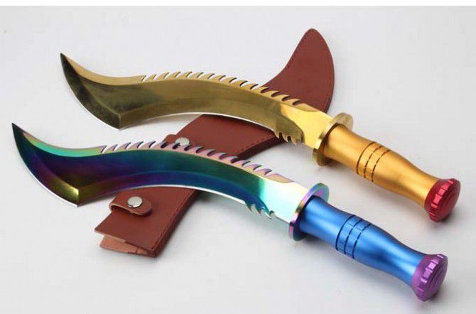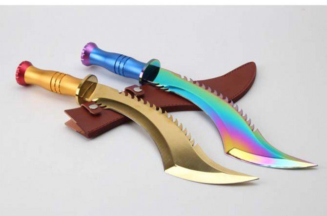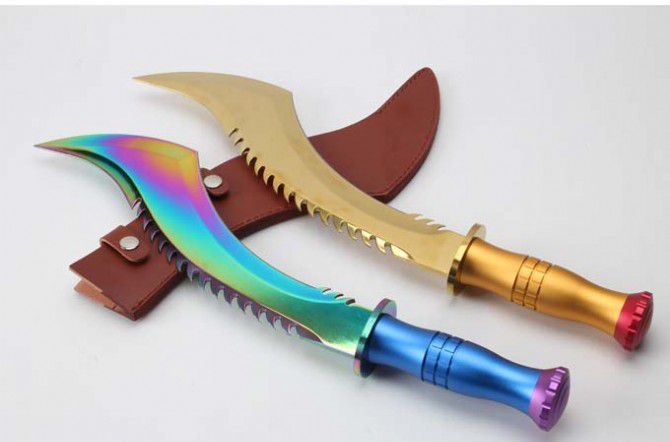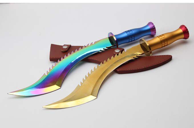 犀牛背狗腿刀(黄金、彩钛) 全 长:493mm 刃 长:350mm 柄 长:140mm 刃 宽:75mm最宽处 刃 厚:5mm 刃 材:9cr18mov 重 量:1776g(含包装) 硬 度:59HRC 表 面:金色