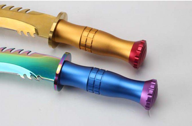 犀牛背狗腿刀(黄金、彩钛) 全 长:493mm 刃 长:350mm 柄 长:140mm 刃 宽:75mm最宽处 刃 厚:5mm 刃 材:9cr18mov 重 量:1776g(含包装) 硬 度:59HRC 表 面:金色 柄 材:一体钢+铝柄