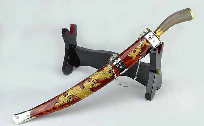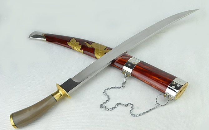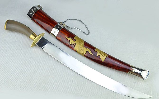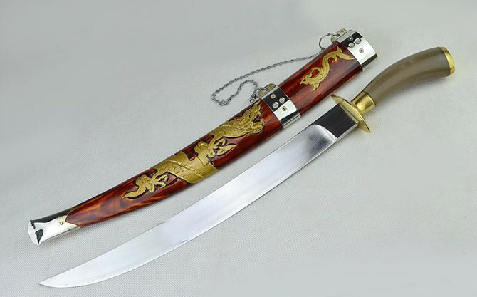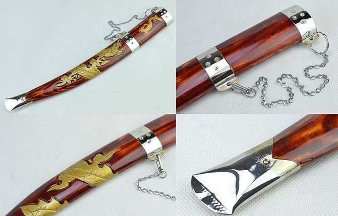 全长:52.5cm 刃长:39cm 刃宽:3.4cm 刃厚:0.76cm 刃材:弹簧钢 柄长: 12cm 重量:800克(含鞘) 鞘材:木+龙雕 装材:包钢 柄材:铜+花牛角 硬度区间:60HRC 性能:手工精细研磨全开锋,削纸断竹砍、削发如泥、锋利无比。 备注:手工产品存在误差,规格仅供参考,请以实物为准!