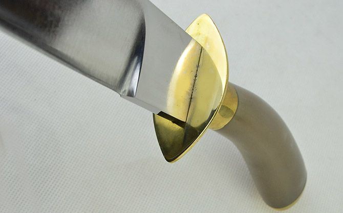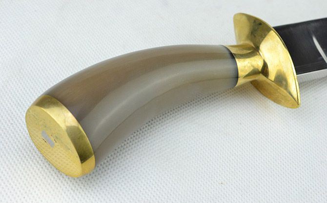 户撒龙壳花牛角弯月刀 全长:52.5cm 刃长:39cm 刃宽:3.4cm 刃厚:0.76cm 刃材:弹簧钢 柄长: 12cm 重量:800克(含鞘) 鞘材:木+龙雕 装材:包钢 柄材:铜+花牛角 硬度区间:60HRC 性能:手工精细研磨全开锋,削纸断竹砍、削发如泥、锋利无比。 备注:手工产品存在误差,规格仅供参考,请以实物为准!