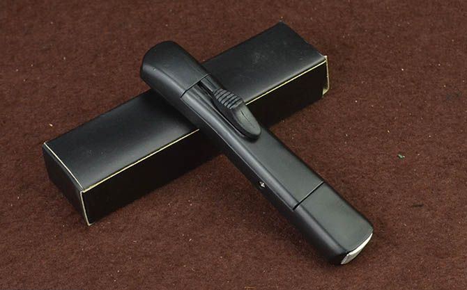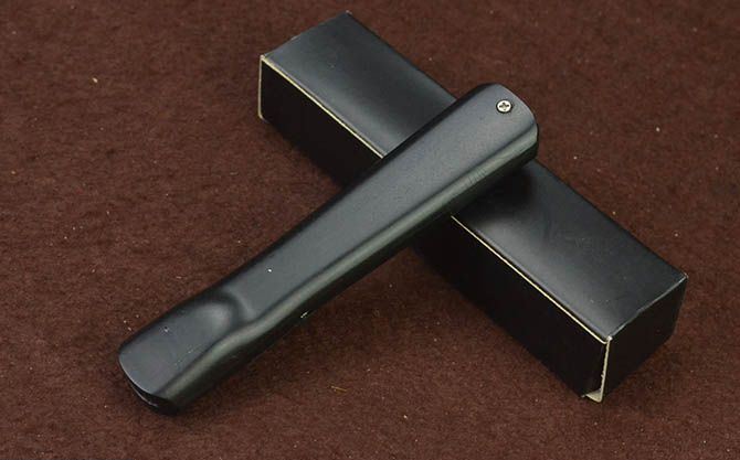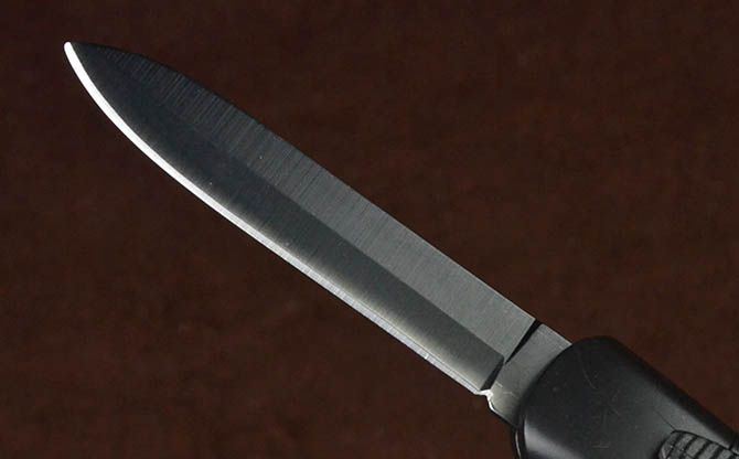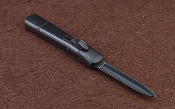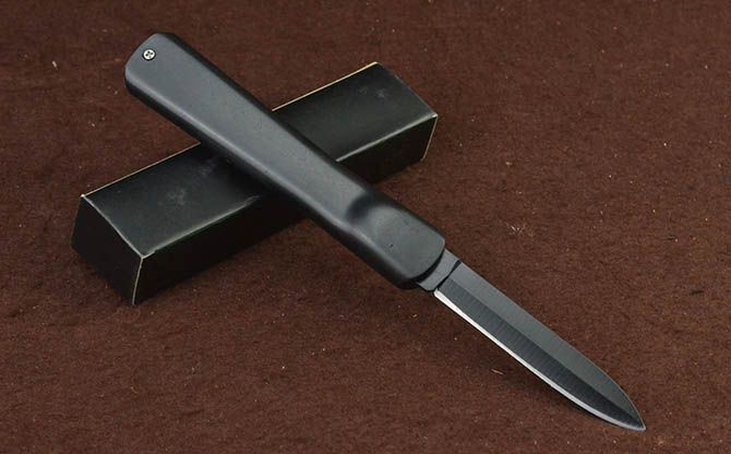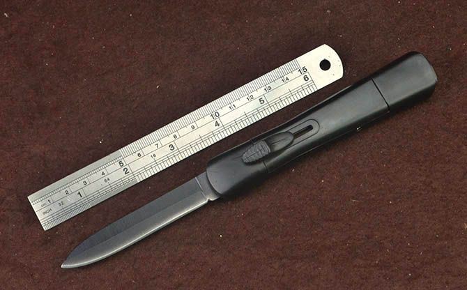 简易14S-10直出弹簧刀 全 长: 20.3cm 刃 长: 7.7cm 刃 厚: 2.2mm 刃 宽: 1.5cm 柄 长: 12.3cm 刃 材: 3CR13 硬 度: 55HRC 重 量: 57g(含黑盒子) 表 面: 黑刃 柄 材: ABS塑料 锁 闭: 直出弹簧刀