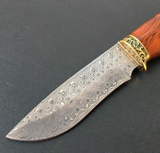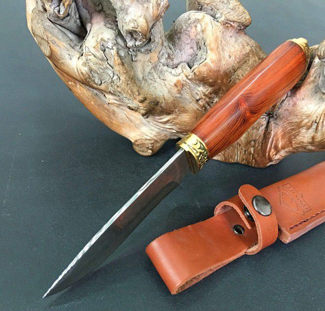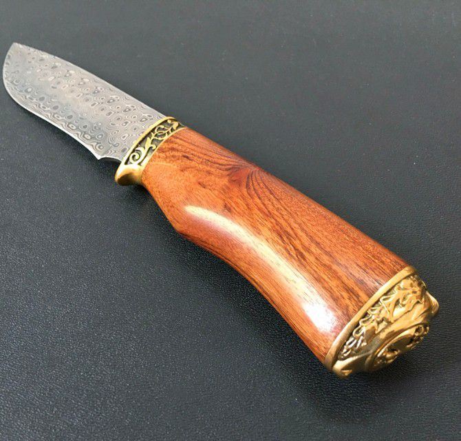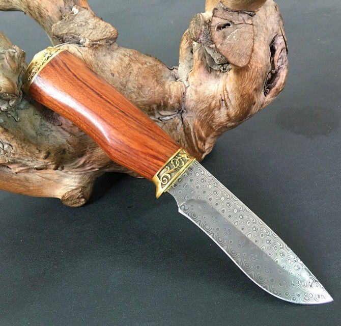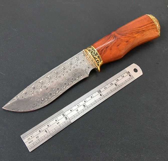 进口瑞粉大马士革钢玫瑰猎刀 全 长:23cm 刃 长:11cm 柄 长:12cm 刃 宽:3cm 刃 厚:3.5mm 刃 材:大马士革 重 量:200g(含包装) 硬 度:58HRC 表 面:进口瑞粉大马士革 柄 材:双铜头+酸枝