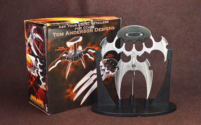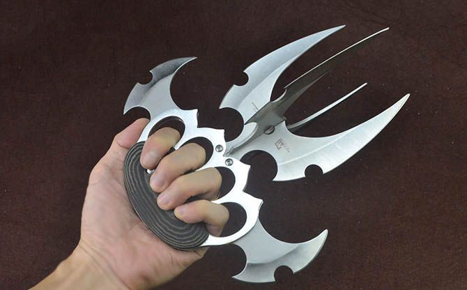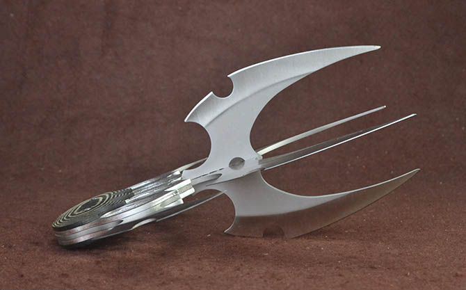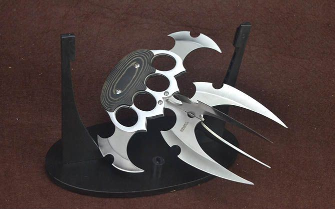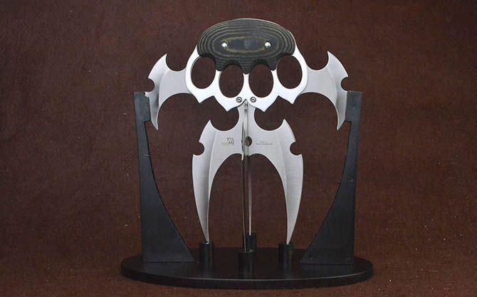 金刚银河TA86四蟹拳刃 全长:22.5厘米 宽度:20cm 刃长:12.8厘米,7.8厘米 刃厚:0.28厘米 刃材:高级不锈钢 表面:砂光 柄材: 合金+米克塔 手柄:9.5cm 重量:900(含包装) 包装:挂式木座、彩盒