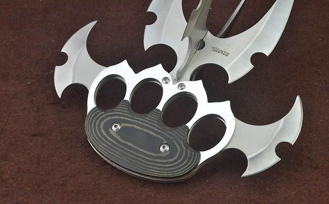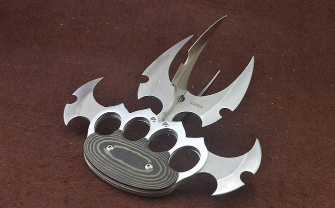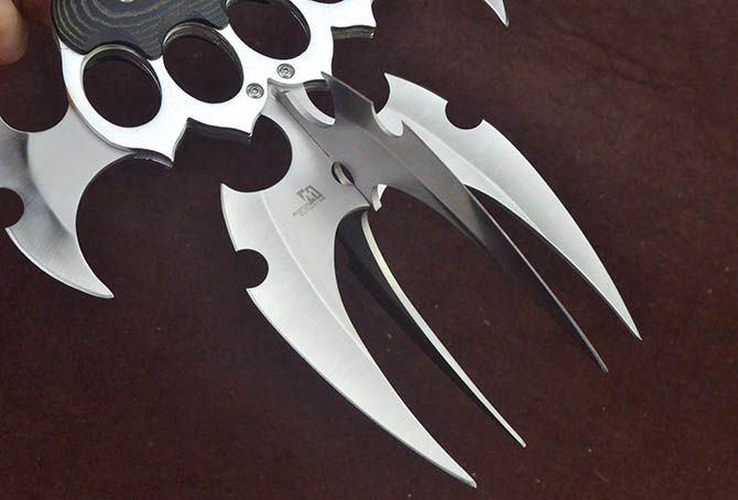 金刚银河TA86四蟹拳刃 全长:22.5厘米 宽度:20cm 刃长:12.8厘米,7.8厘米 刃厚:0.28厘米 刃材:高级不锈钢 表面:砂光 柄材: 合金+米克塔 手柄:9.5cm 重量:900(含包装)