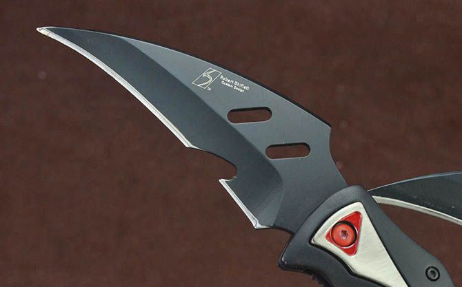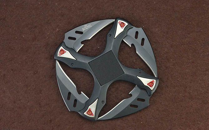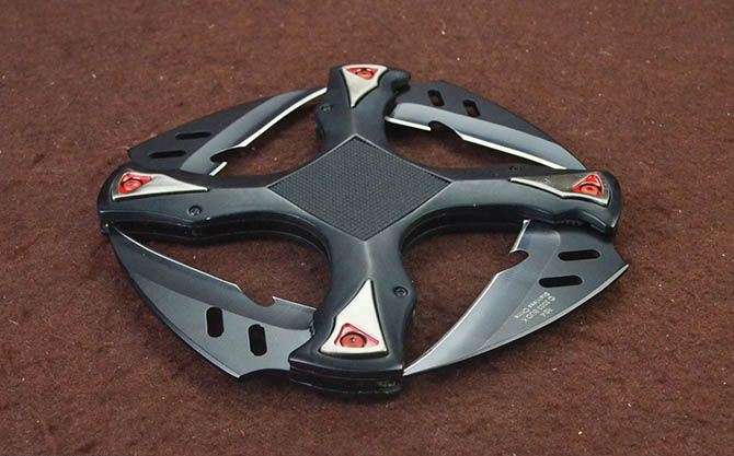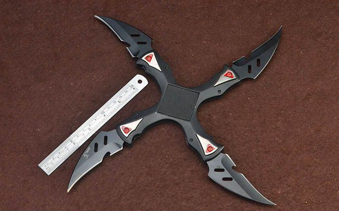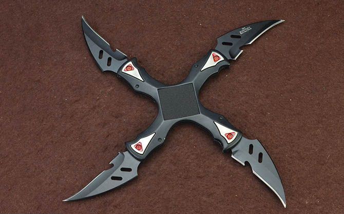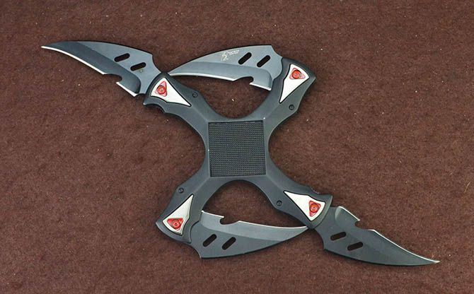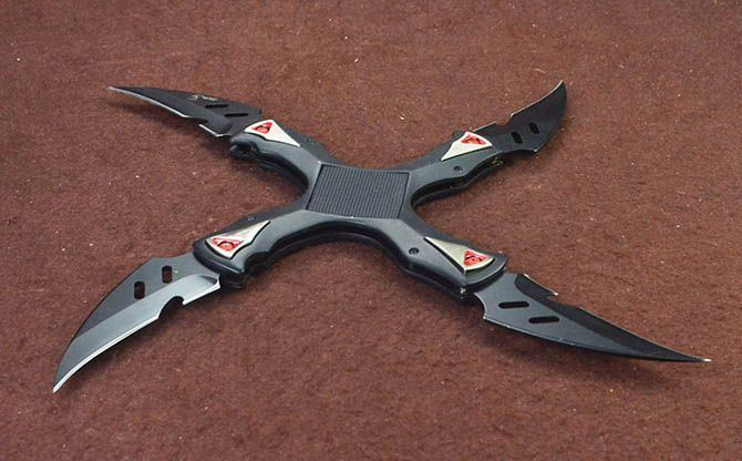 BK555四叶折叠飞刀 打开全长:34厘米 闭合全长:16.5cm 刃长:8.3厘米 刃厚:0.28厘米 刃材:高级不锈钢 刃面:发黑 柄材: 合金发黑 锁闭:线锁 重量:450克(含包装) 包装:彩盒