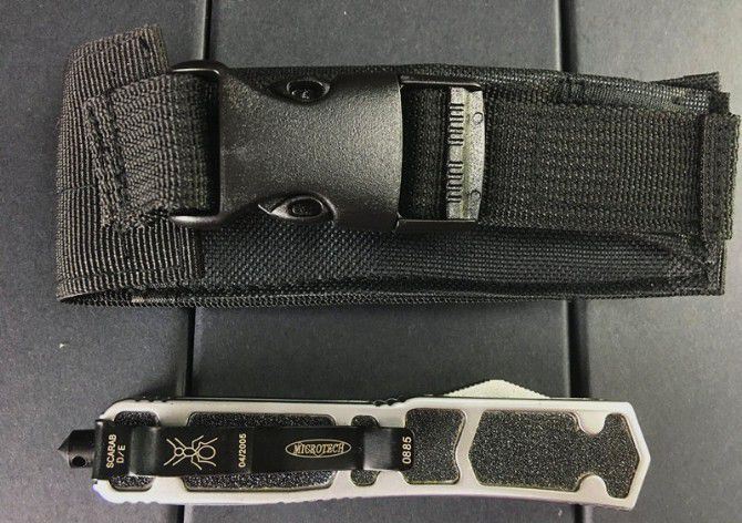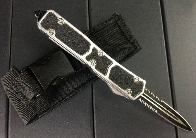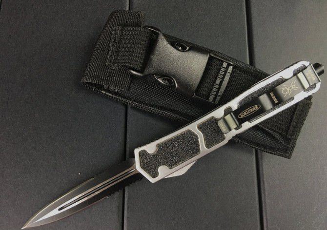 微技术双锋白蚁直弹(双锋半齿) 开启长度:21.8CM 合起长度:13.3CM 刃 长:8.5cm 刃 厚:0.3CM 硬 度:57 HRC 刃 材:440 表 面:黑色 把 手:航空铝合金+砂纸皮 净 重:180克(整刀) 毛 重:280克(含包装物) 开 合:双动作,直推开关,自动弹出和收回(刀头比较牢固,只有很轻微的摇动) 包 装:耐磨专用战术尼龙套。口袋刀夹:弹簧刀夹玻璃敲击器:钨质玻璃敲击器