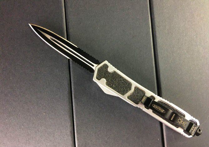 微技术双锋白蚁直弹(双锋半齿) 开启长度:21.8CM 合起长度:13.3CM 刃 长:8.5cm 刃 厚:0.3CM 硬 度:57 HRC 刃 材:440 表 面:黑色 把 手:航空铝合金+砂纸皮 净 重:180克(整刀) 毛 重:280克(含包装物) 开 合:双动作,直推开关,自动弹出和收回(刀头比较牢固,只有很轻微的摇动)