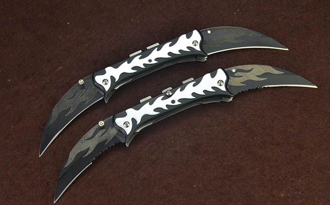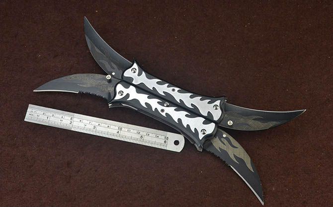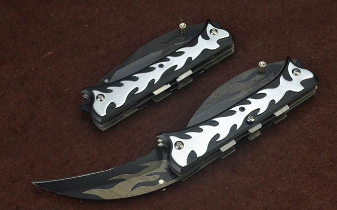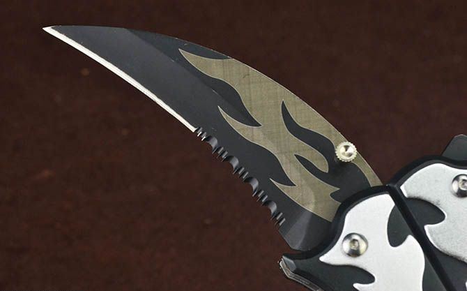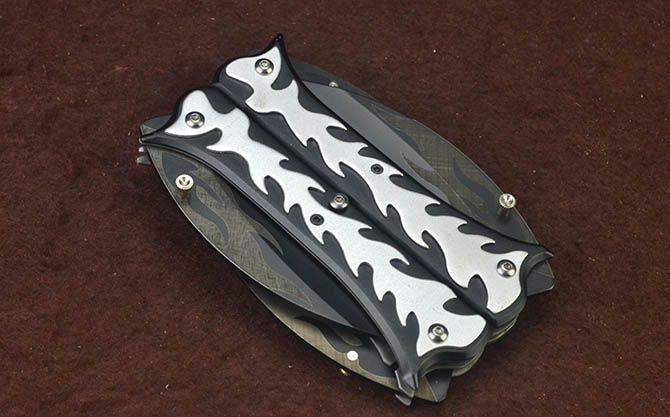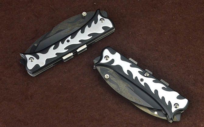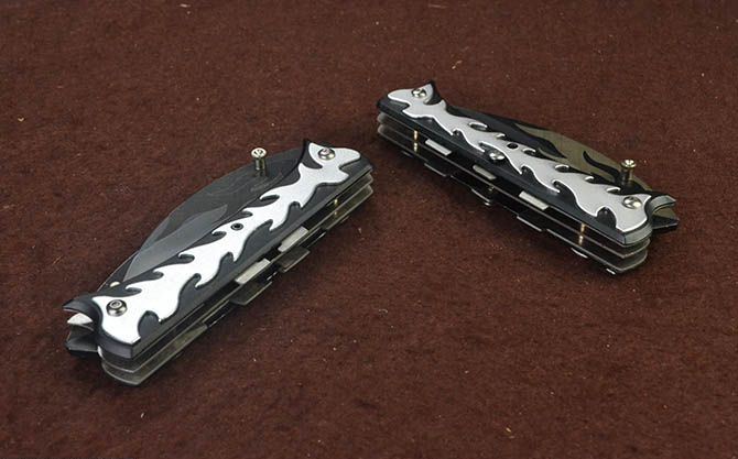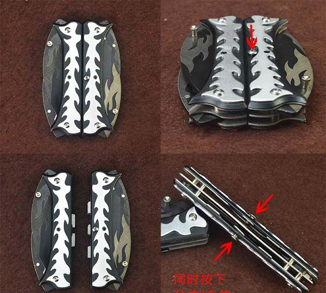 合体4刃折刀 全 长:27cm 刃 长:8cm 柄 长:12cm 全闭合合体柄宽:8cm 刃 宽:2.8cm 刃 厚:2.8mm 刃 材:3Cr13Mov 重 量:350g (含包装) 硬 度:56HRC 表 面:镀钛 柄 材:铝柄 锁 闭:线锁