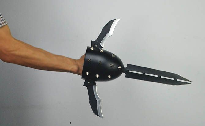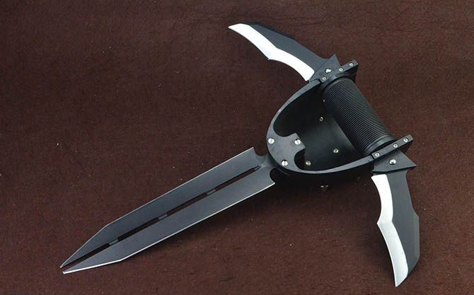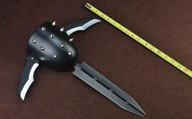 银河战士TA78拳盔铆钉三叉刀 全长:40.5cm 宽长度:37.5cm 刃长:25cm(长刃),12.5cm(短刃) 刃宽:5.3cm(长刃),4.5cm(短刃) 刃厚:4mm(长刃),3mm(短刃) 手柄:10cm 挡手:24.5cm 重量:1700克 包装:泡沫箱、白盒
