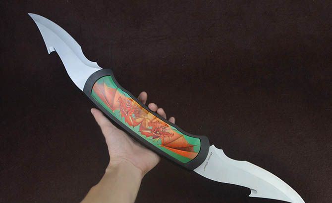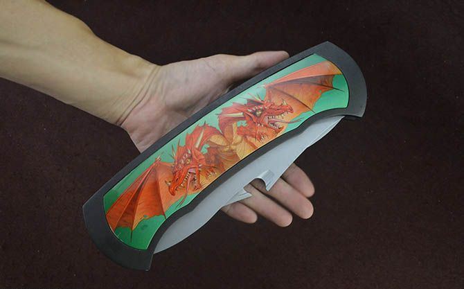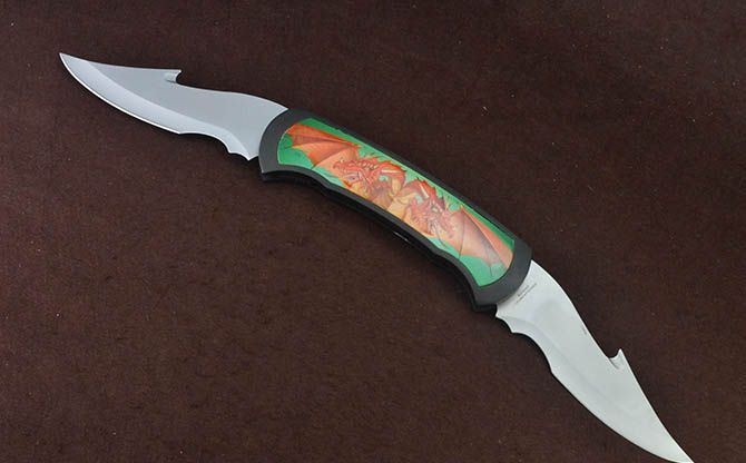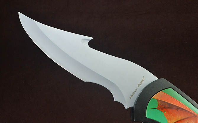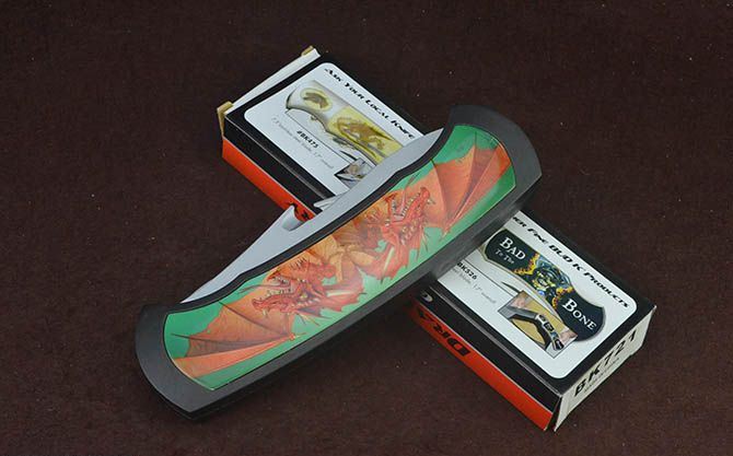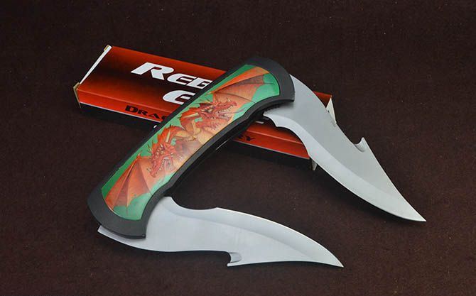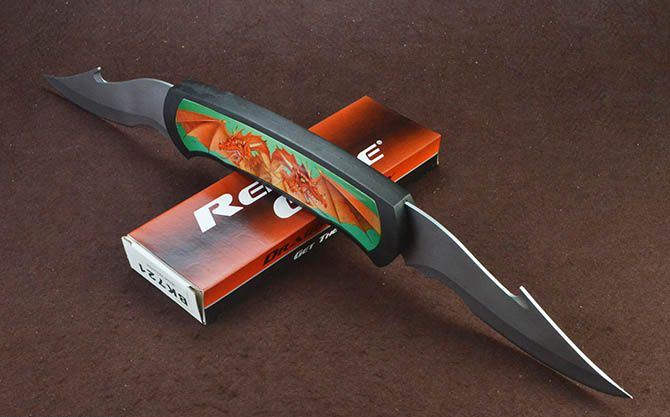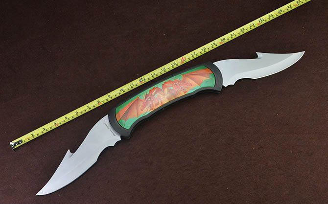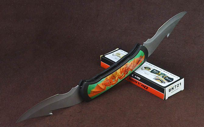 BK721蝙蝠龙超大型2刃折刀 全 长:63.5cm 刃 长:17.5cm 柄 长:25cm 刃 宽:6cm 刃 厚:2.7mm 刃 材:440 重 量:930g(含包装) 硬 度:56HRC 表 面:灰钛 柄 材:铸铝 锁 闭:线锁