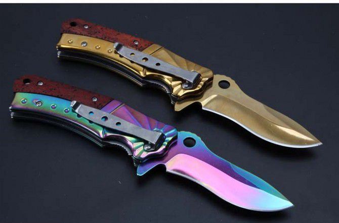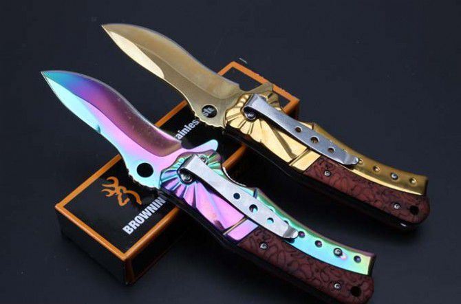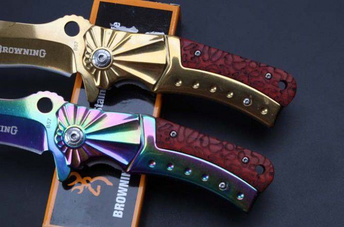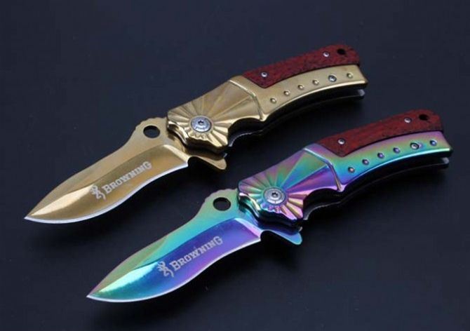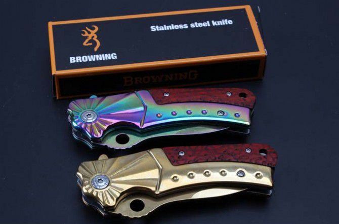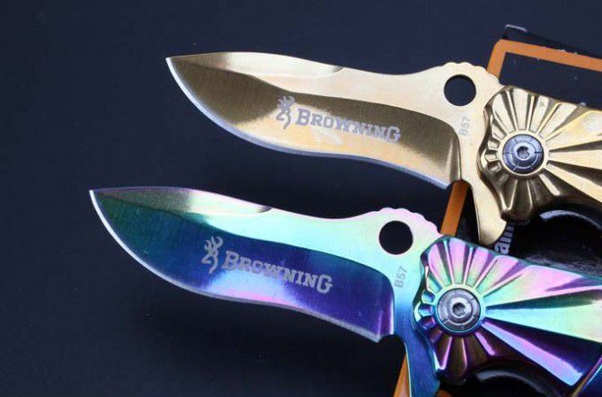 勃朗宁B57轴承翻转折刀 全 长:20cm 刃 长:8.3cm 刃 宽:3.1cm(最宽处) 刃 厚:2.9mm 柄 长:11.3cm 表 面:镀钛 刃 材:5CR15 硬 度:57HRC 柄 材:镀钛钢头+ 彩木 总 重:203克(含彩盒子) 颜 色:金色、彩钛 锁 闭:线锁 备 注:带腰夹