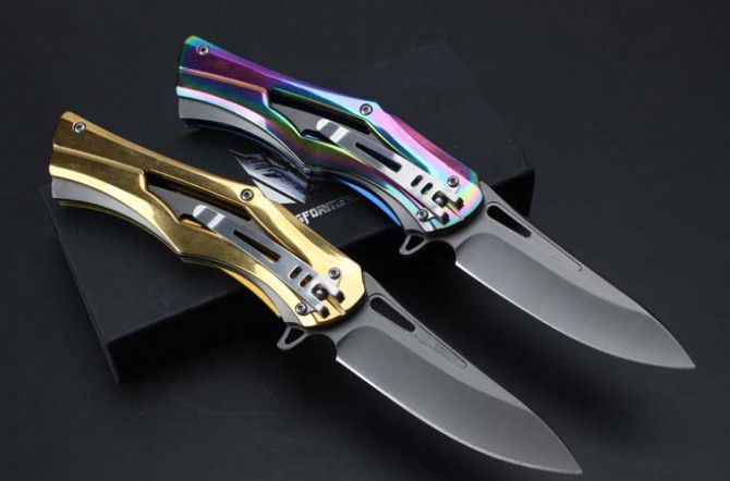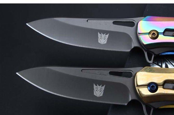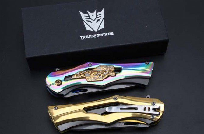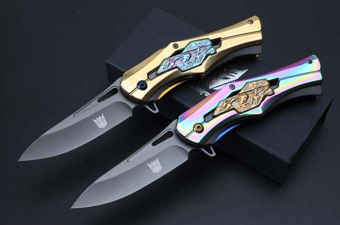 猛兽变型金刚快开折刀(金色、彩钛) 全长:203mm 刃长:84mm 柄长:118mm 刃宽:25mm 刃厚:3mm 刃材:5铬15 重量:301g(含包装物) 硬度:58HRC 表面:灰钛 柄材:手柄全钢手柄电脑椤缕空、底骨全钢电镀处理 刀夹:全钢 锁型:分体插入锁杆式线锁