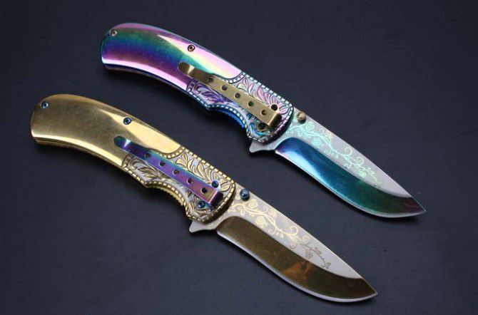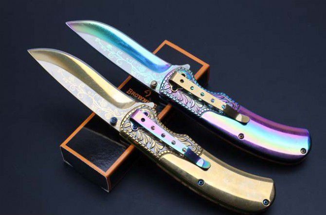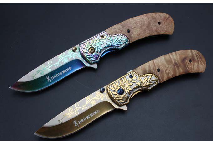 勃朗宁浮雕影木快开折刀(彩钛、金色) 全 长:20.8mm 刃 长:8.8mm 柄 长:119mm 刃 宽:2.7mm 刃 厚:2.2mm 刃 材:5Cr13 重 量:200g(含包装) 硬 度:58HRC 表 面:雕刻纹彩钛和金色 柄 材:浮雕钢柄图案凸起+影木 锁 型:快开
