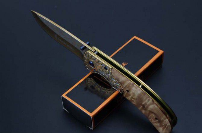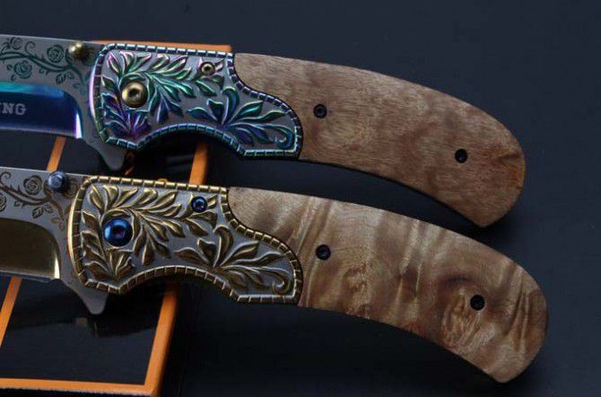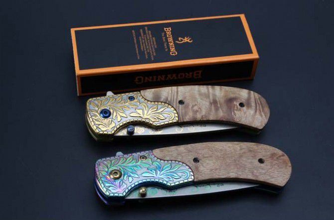 勃朗宁浮雕影木快开折刀(彩钛、金色) 全 长:20.8mm 刃 长:8.8mm 柄 长:119mm 刃 宽:2.7mm 刃 厚:2.2mm 刃 材:5Cr13 重 量:200g(含包装) 硬 度:58HRC 表 面:雕刻纹彩钛和金色 柄 材:浮雕钢柄图案凸起+影木 锁 型:快开 其 他:配彩盒