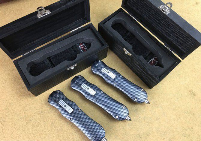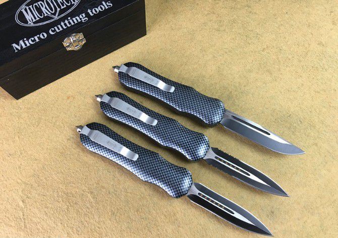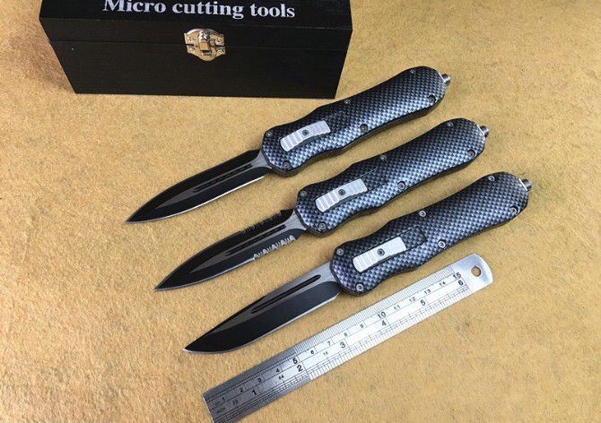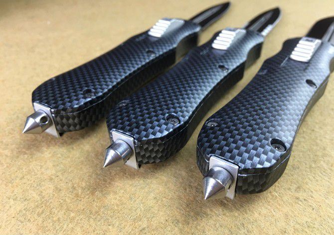 伤齿龙Z123碳纤维直出跳刀 全 长: 20.5cm (含尾锥长度) 刃 长: 8.5cm 刃 厚: 2.8mm 刃 材: 440 硬 度: 57HRC 刀净重:300克 总重量: 500克(含包装物) 表 面: 黑白(刀刃) 柄 材: 仿碳纤维 刀 鞘: 尼龙 锁 闭: 弹簧直出 备 注:带背夹和玻璃撞针