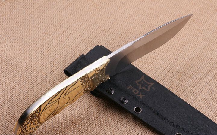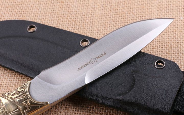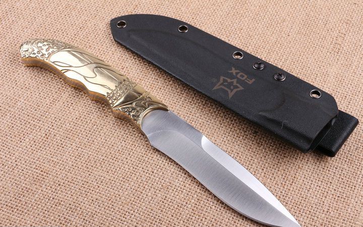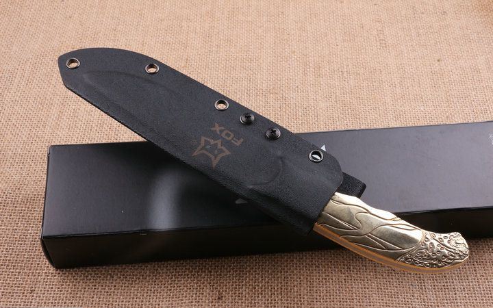 狐狸FOX之首直刀 全长:250cm 刃长:12.8cm 柄长:12.2cm 刃厚:4.9mm 刃宽:3.1cm 刃材:5CR15MOV 柄材:龙骨结构+扎图案铜柄 硬度:56HRC 净重:380克 毛重:530克(含包装物) 表面处理:砂光 刀套:K鞘和原厂彩盒