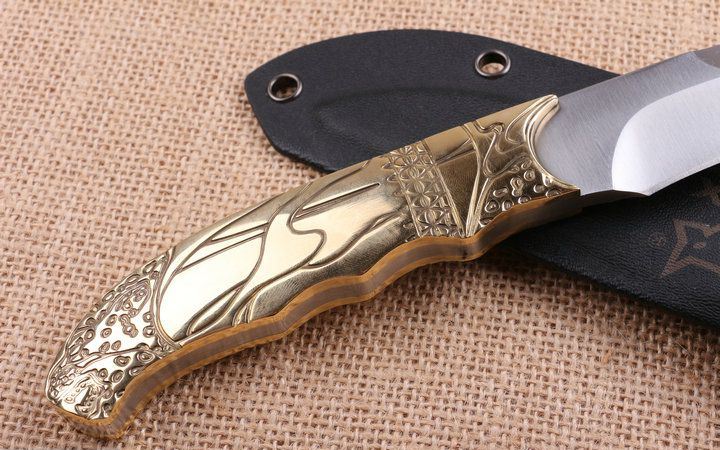 狐狸FOX之首直刀 全长:250cm 刃长:12.8cm 柄长:12.2cm 刃厚:4.9mm 刃宽:3.1cm 刃材:5CR15MOV 柄材:龙骨结构+扎图案铜柄 硬度:56HRC 净重:380克 毛重:530克(含包装物) 表面处理:砂光