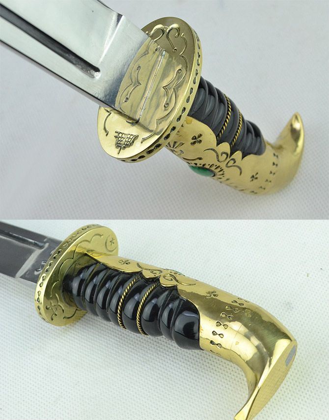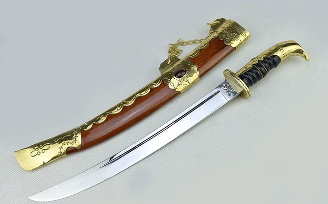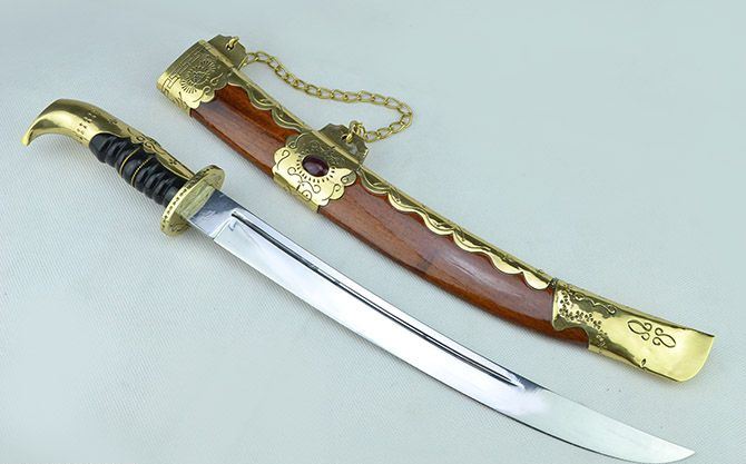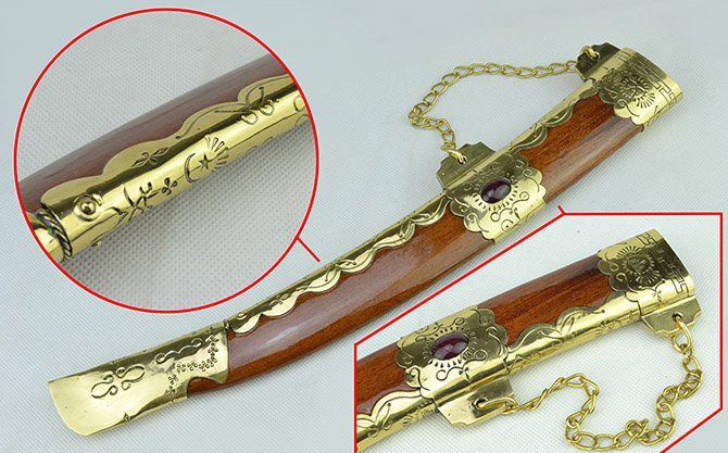 全长:47cm 刃长:34.5cm 刃宽:3cm 刃厚:0.61cm 刃材:弹簧钢 柄长: 11.3cm 重量:820克(含鞘) 鞘材:木+鞘背包铜 装材:铜+牛角+绿松石 柄材:铜+牛角+绿松石 硬度区间:60HRC 性能:手工精细研磨全开锋,削纸断竹、削发如泥。 备注:手工产品存在误差,规格仅供参考,请以实物为准!