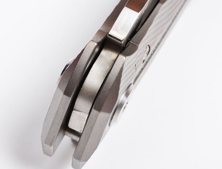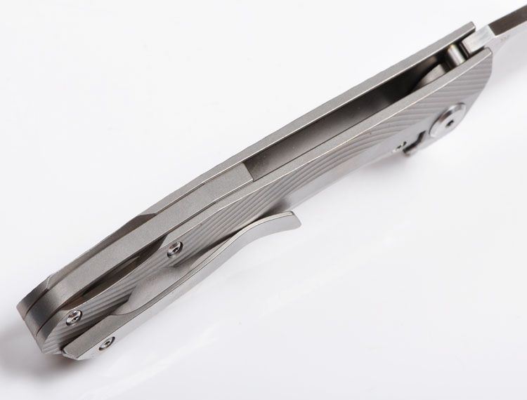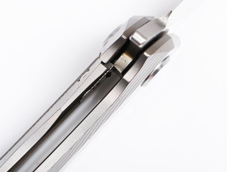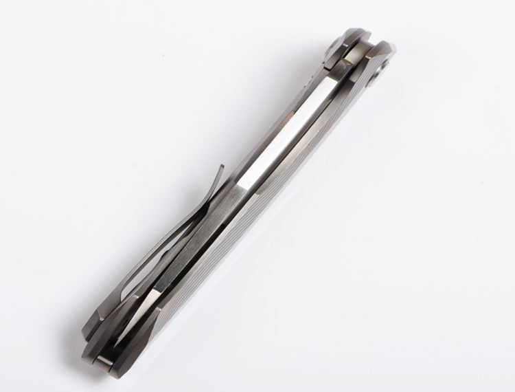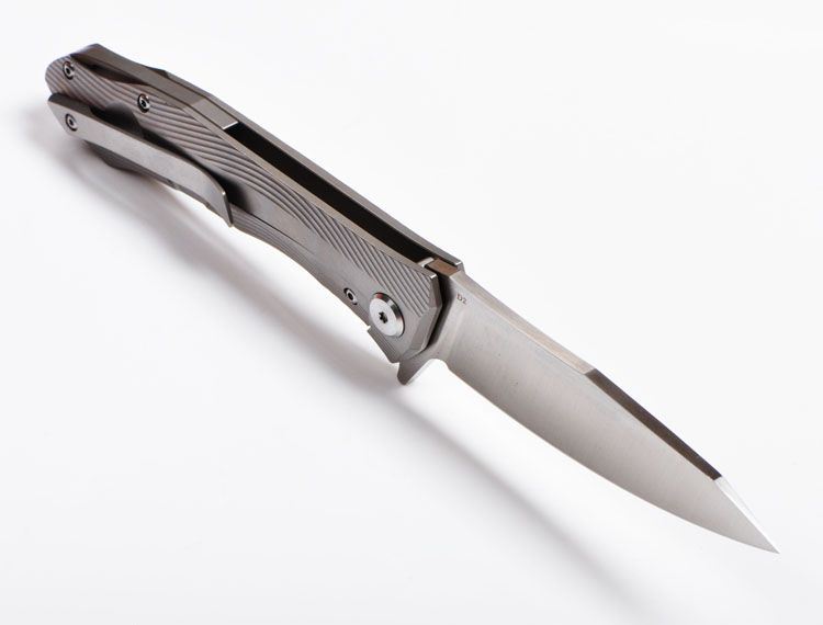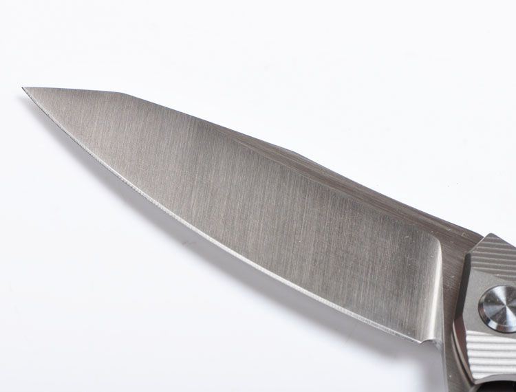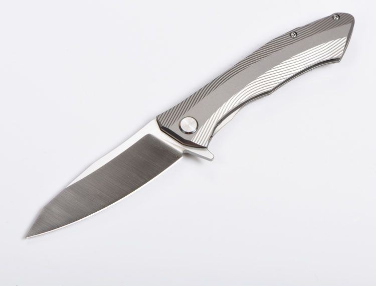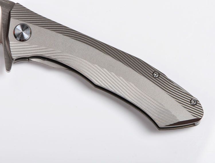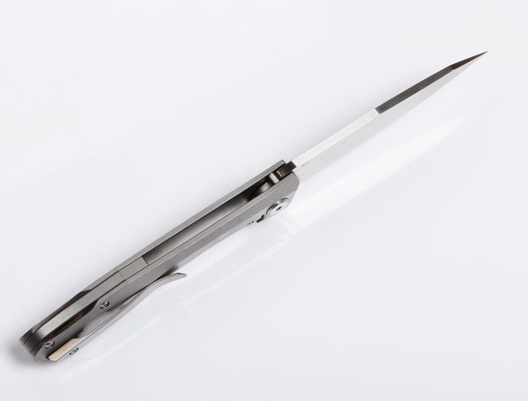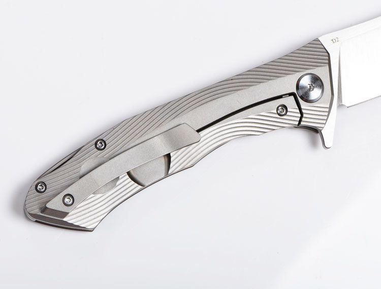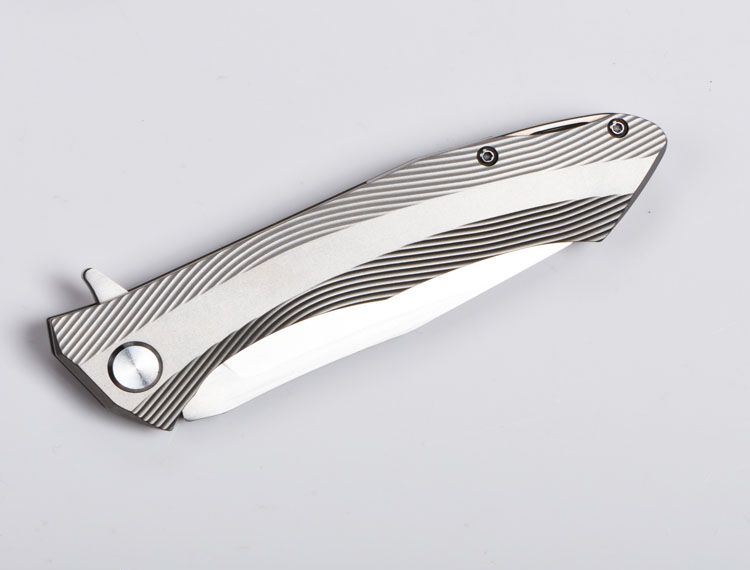 ZF原氏F11快开折刀D2钢 全长:215mm 刃长:95mm 在折叠位置的手柄长度:123mm 刃厚度:3.8mm 刃宽:160mm(最宽处) 柄宽:26mm(最宽处) 材料:D2(深冷处理) 洛氏硬度(Hrc):60-61 刃处理:精幼手工拉丝 包含:切削刃的刀片 手柄材料:钛合金6Al4V 手柄处理:电脑锣精雕加工图案+喷沙 锁定类型:一体线锁 开放:快开/陶瓷滚珠轴向节点(含双2rbs rows系统-双行的轴承) 净重量:122g 毛重:170g