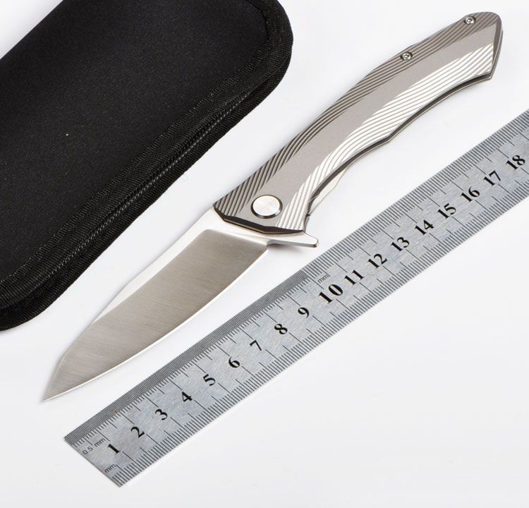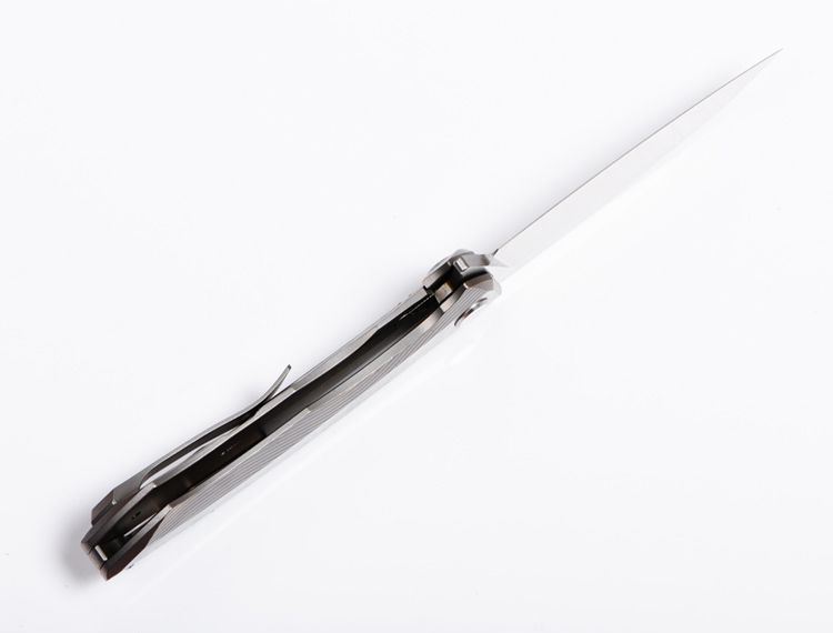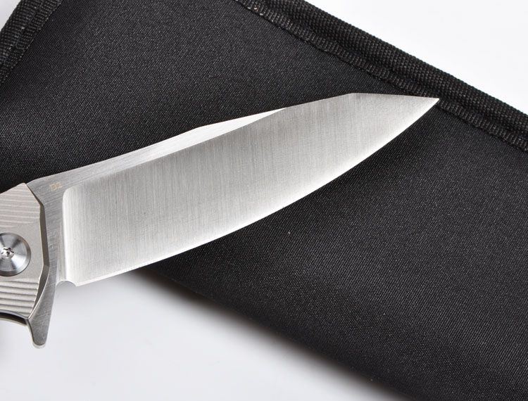 ZF原氏F11快开折刀D2钢 全长:215mm 刃长:95mm 在折叠位置的手柄长度:123mm 刃厚度:3.8mm 刃宽:160mm(最宽处) 柄宽:26mm(最宽处) 材料:D2(深冷处理) 洛氏硬度(Hrc):60-61 刃处理:精幼手工拉丝 包含:切削刃的刀片 手柄材料:钛合金6Al4V 手柄处理:电脑锣精雕加工图案+喷沙 锁定类型:一体线锁 开放:快开/陶瓷滚珠轴向节点(含双2rbs rows系统-双行的轴承) 净重量:122g 毛重:170g 包装:高端黑布夹棉拉链套