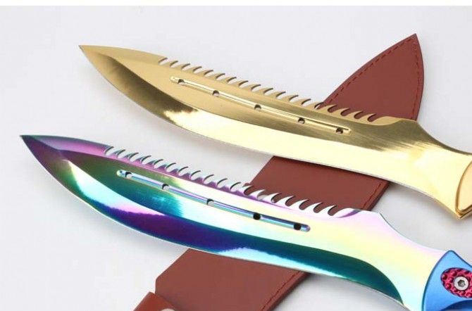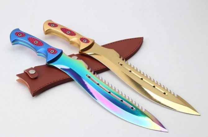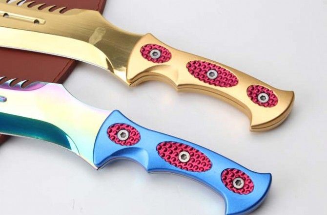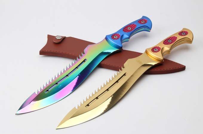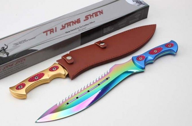 ZT工坊翼龙一体柄彩金直刀 全 长:47mm 刃 长:320MM 柄 长:150m 刃 宽:4.9mm 刃 厚:4.8mm 刃 材:7Cr17Mov 重 量:1071g(含包装) 硬 度:57HRC 表 面:镀钛 柄 材:铝柄 锁 型:定锁 其 他:皮套和硬纸盒