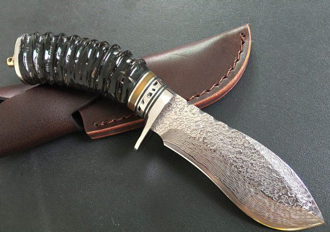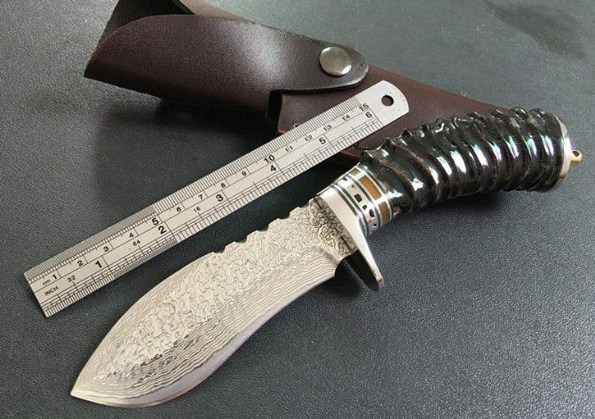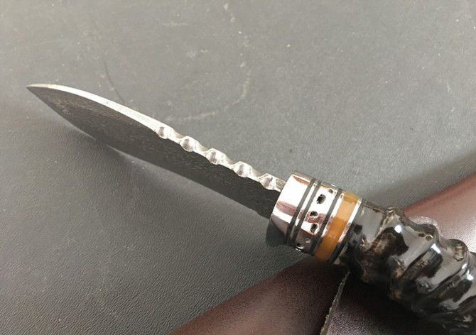 牛角水滴雨大马士革直刀 全 长:21cm 刃 长:10cm 刃 宽:3.8cm(最宽处) 刃 厚:3.7mm 柄 长:11cm 表 面:锻打大马士革本色花纹 刃 材:大马士革钢 硬 度:59HRC 柄 材:双钢头+牛角 重 量:400克(含包装) 包 装:皮套、纸盒。