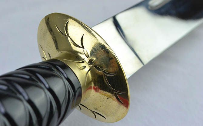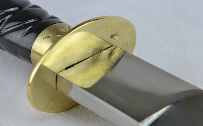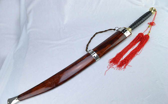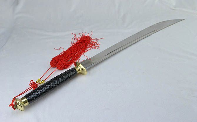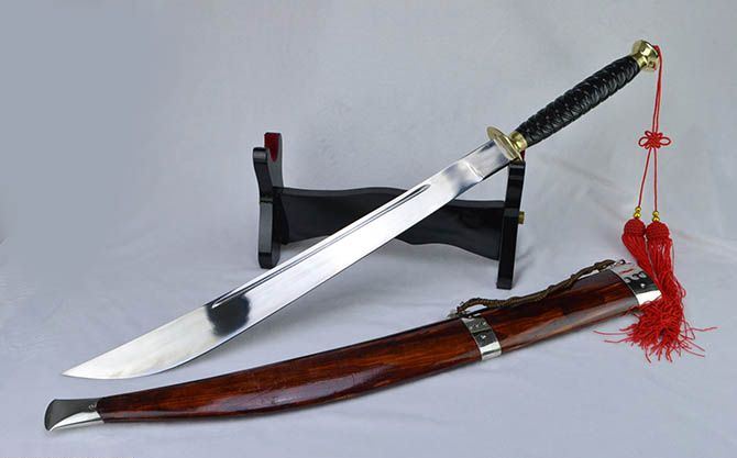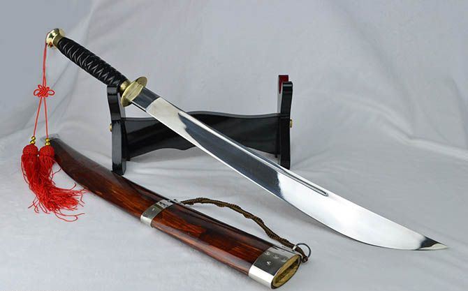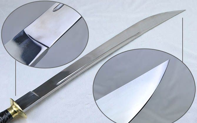 全长:80cm 刃长:56cm 刃宽:5cm 刃厚:0.83cm 刃材:弹簧钢 柄长: 22.5cm 重量:1600克(含鞘) 鞘材:木 装材:包钢 柄材:铜+木 硬度区间:60HRC 性能:手工精细研磨全开锋,削纸断竹砍、削发如泥、锋利无比。 备注:本品不含刀架,手工产品存在误差,规格仅供参考,请以实物为准!