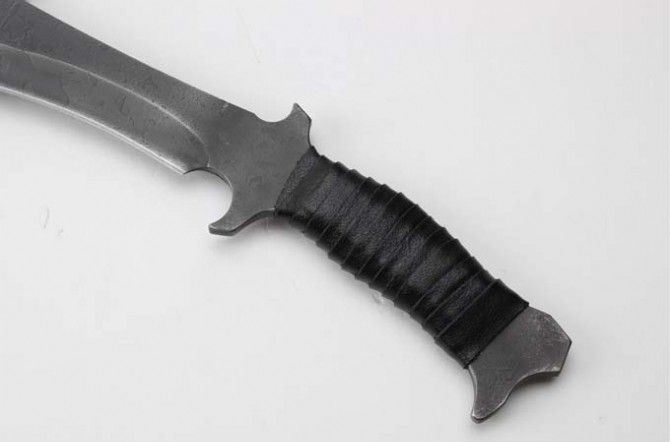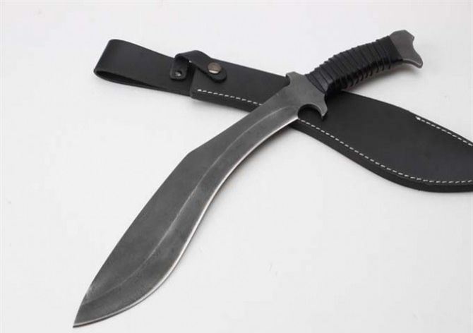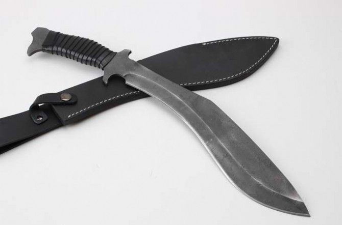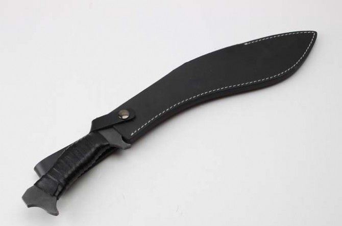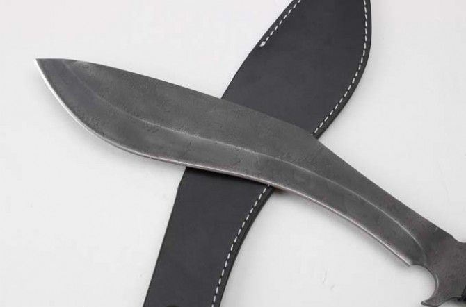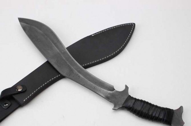ZT工坊僵尸海怪狗腿刀 全 长:480mm 刃 长:310mm 柄 长:160mm 刃 宽:58mm 刃 厚:4.6mm 刃 材:9Cr18Mov 重 量:929g(含包装) 硬 度:58HRC 表 面:腐蚀纹 柄 材:一体钢+扎皮 锁 型:定锁