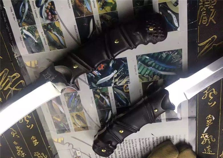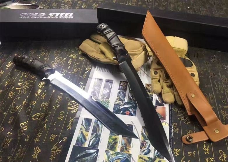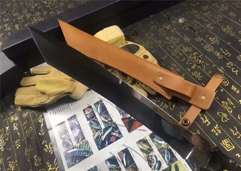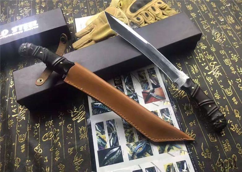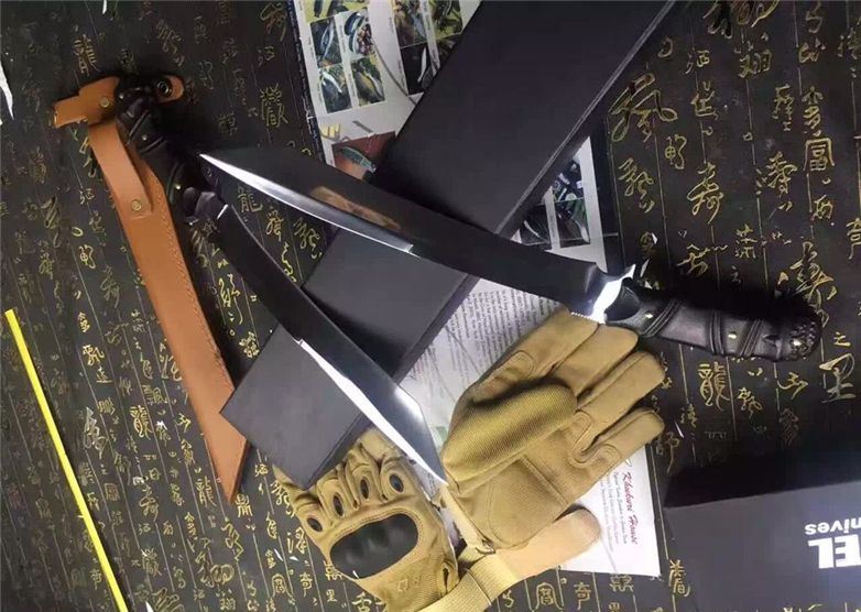 加长版Fox千年狐狸狩猎刀(超镜面) 全长:38CM 刃长:26CM 柄长:11.5CM 刃材:9Cr17 硬度:59HRC 刃厚:0.59CM 刃宽:3.3CM (最宽处) 刀刃表面:镜光 柄材:黑檀木,电脑雕刻防滑格纹 刀鞘:皮套(配硬盒) 重量:900g(含包装)