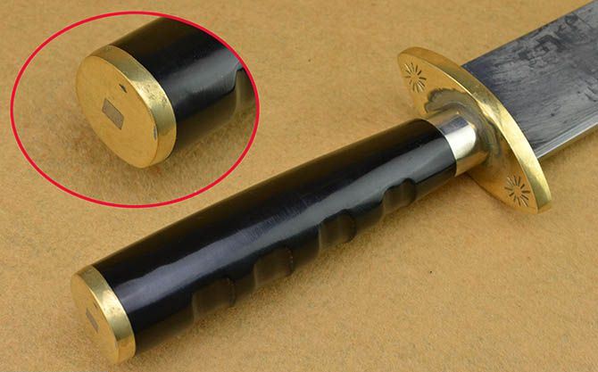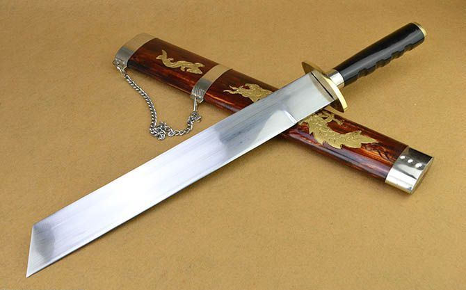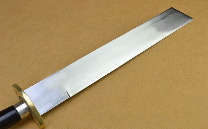 全长:57.5cm 刃长:40.5cm 刃宽:5cm 刃厚:0.66cm 刃材:弹簧钢 柄长: 16cm 重量:1450克(含鞘) 鞘材:木 柄材:铜+黑牛角,一体龙骨 硬度区间:60HRC 性能:手工精细研磨全开锋,削纸断竹砍、削发如泥、锋利无比。 备注:本品不含刀架,手工产品存在误差,规格仅供参考,请以实物为准!