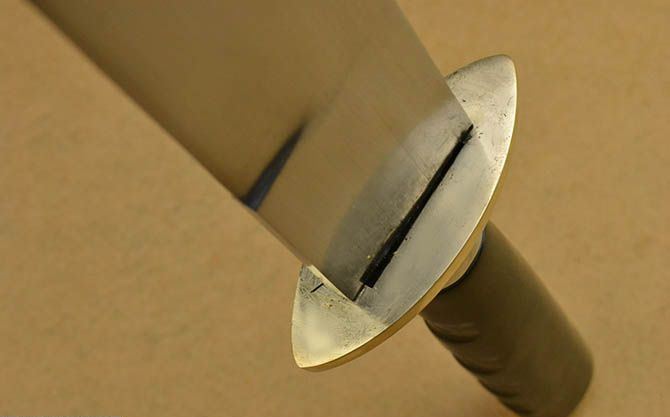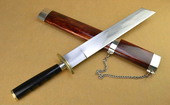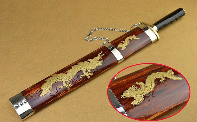 户撒凌空斩(中号40公分) 全长:57.5cm 刃长:40.5cm 刃宽:5cm 刃厚:0.66cm 刃材:弹簧钢 柄长: 16cm 重量:1450克(含鞘) 鞘材:木 柄材:铜+黑牛角,一体龙骨 硬度区间:60HRC 性能:手工精细研磨全开锋,削纸断竹砍、削发如泥、锋利无比。 备注:本品不含刀架,手工产品存在误差,规格仅供参考,请以实物为准!