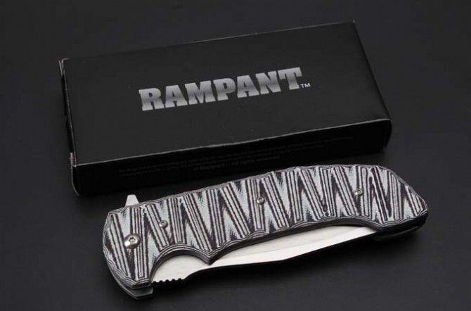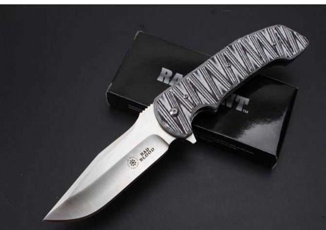 BADBLOOD-0129M高端折刀 全 长:235mm 刃 长:98mm 柄 长:132mm 刃 宽:33mm(最宽处) 刃 厚:4mm 刃 材: 8Cr14Mov 重 量:250g(含包装) 硬 度:58-58HRC 表 面:数控磨 沙光 柄 材:钢+G10 其 他:滚珠轴承系统 锋利可削纸