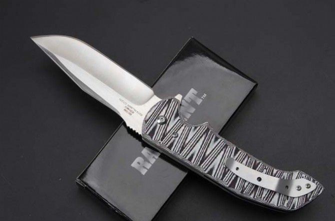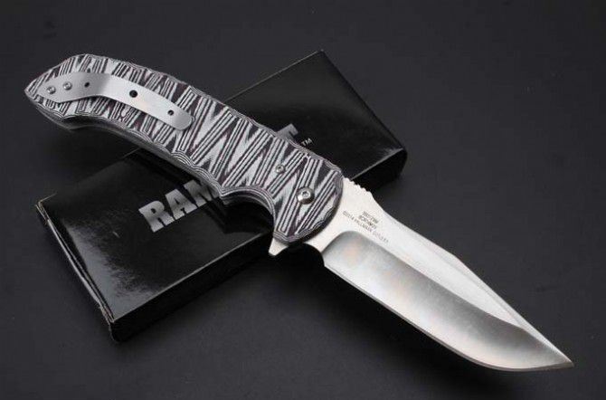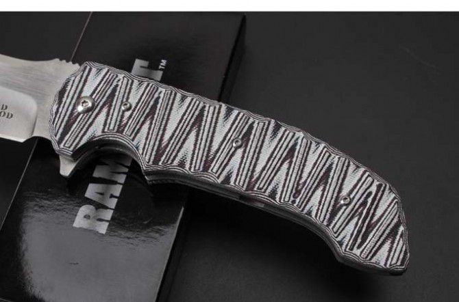BADBLOOD-0129M高端折刀 全 长:235mm 刃 长:98mm 柄 长:132mm 刃 宽:33mm(最宽处) 刃 厚:4mm 刃 材: 8Cr14Mov 重 量:250g(含包装) 硬 度:58-58HRC 表 面:数控磨 沙光 柄 材:钢+G10 其 他:滚珠轴承系统 锋利可削纸 包 装:彩盒