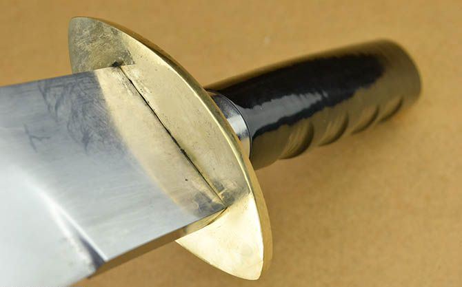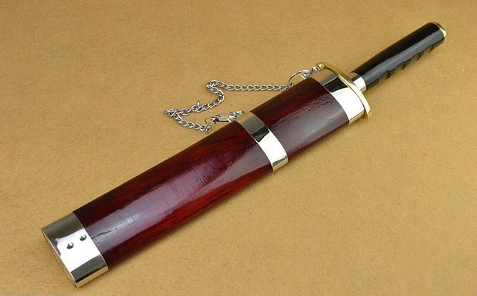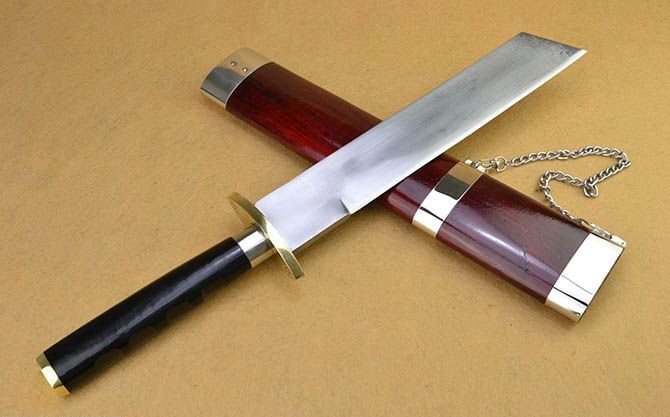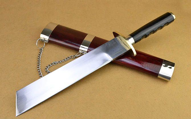 户撒凌空斩(小号30公分) 全长:47cm 刃长:30cm 刃宽:4.8cm 刃厚:0.83cm 刃材:弹簧钢 柄长: 16.5cm 重量:1200克(含鞘) 鞘材:木 柄材:铜+黑牛角,一体龙骨结构 硬度区间:60HRC 性能:手工精细研磨全开锋,削纸断竹砍、削发如泥、锋利无比。 备注:本品不含刀架,手工产品存在误差,规格仅供参考,请以实物为准!