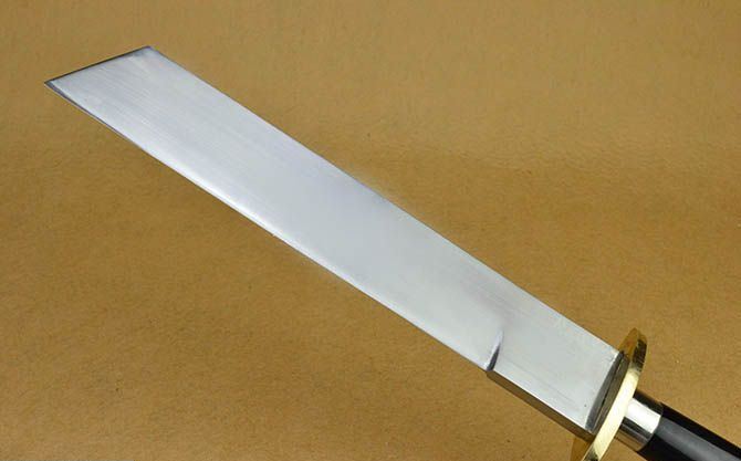 全长:47cm 刃长:30cm 刃宽:4.8cm 刃厚:0.83cm 刃材:弹簧钢 柄长: 16.5cm 重量:1200克(含鞘) 鞘材:木 柄材:铜+黑牛角,一体龙骨结构 硬度区间:60HRC 性能:手工精细研磨全开锋,削纸断竹砍、削发如泥、锋利无比。 备注:本品不含刀架,手工产品存在误差,规格仅供参考,请以实物为准!