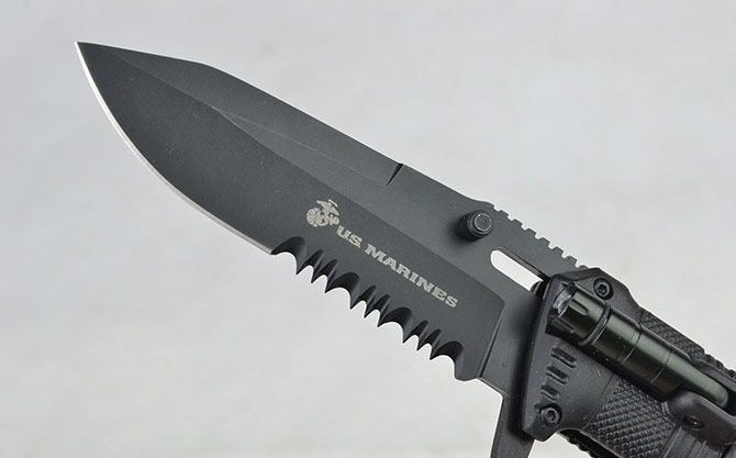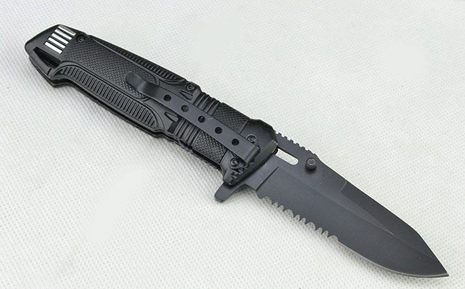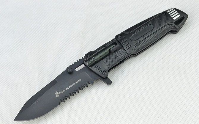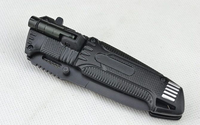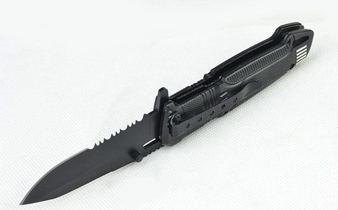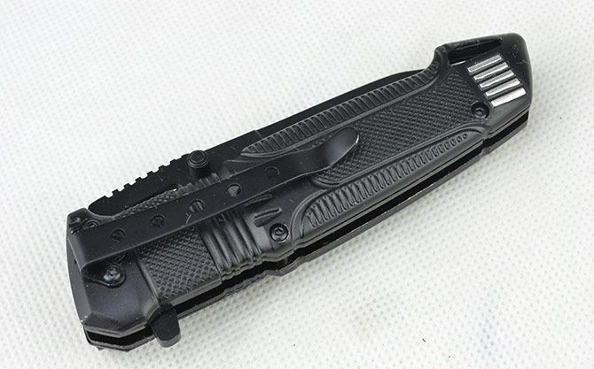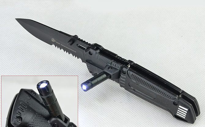 黑炮快开战术折刀 全长:21.2CM 刃长:9CM 刃厚:0.3CM 刃宽:3CM (最宽处) 刃材:440 硬度:56HRC 柄长:12CM 重量:164克(含盒子) 涂层:发黑 柄材:铝合金 锁定:线锁 其他:带腰夹、LED手电筒(可持续发光2小时以上) 包装:白盒子