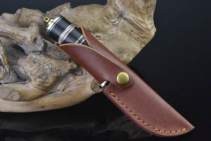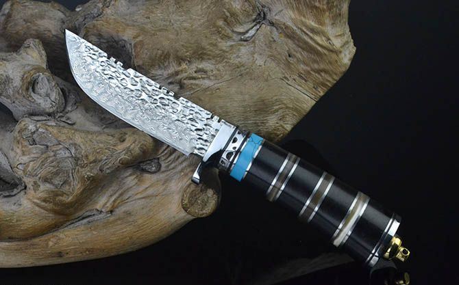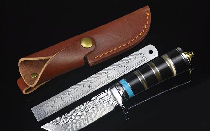 兰蔻大马士革收藏直刀 全 长:20cm 刃 长:9cm 刃 宽:2.6cm(最宽处) 柄 长:9.7cm 刃 厚:3.6mm 刃 材:大马士革 柄 材:双钢头+黑檀木拼绿松石 硬 度:59HRC 表 面:大马士革 重 量:288克(含包装) 包 装:纸盒、皮套