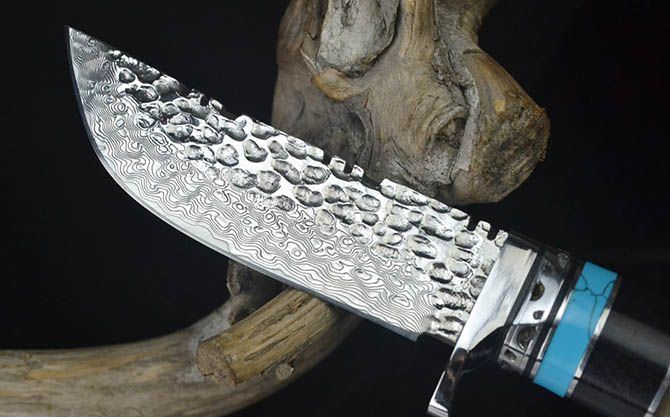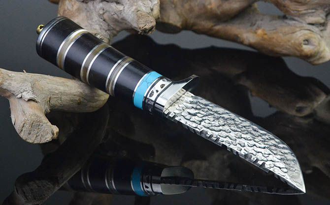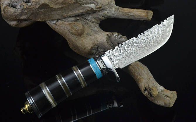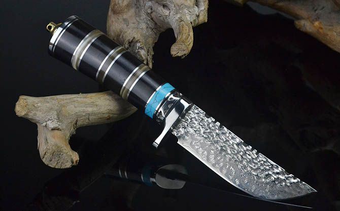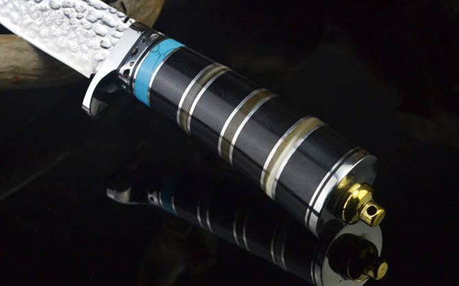 兰蔻大马士革收藏直刀 全 长:20cm 刃 长:9cm 刃 宽:2.6cm(最宽处) 柄 长:9.7cm 刃 厚:3.6mm 刃 材:大马士革 柄 材:双钢头+黑檀木拼绿松石 硬 度:59HRC 表 面:大马士革 重 量:288克(含包装)