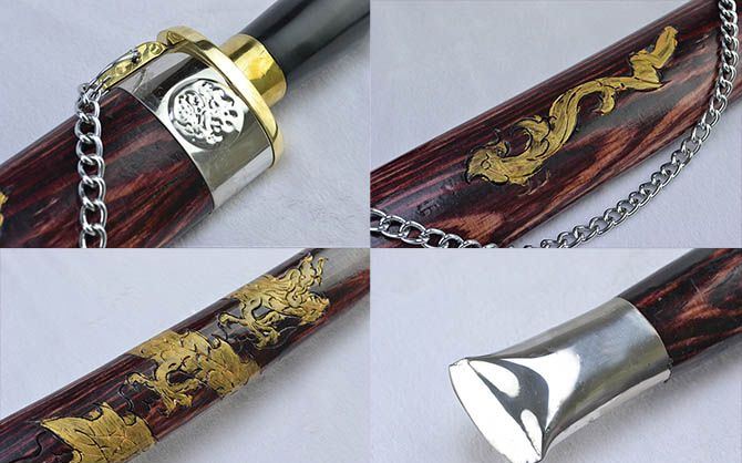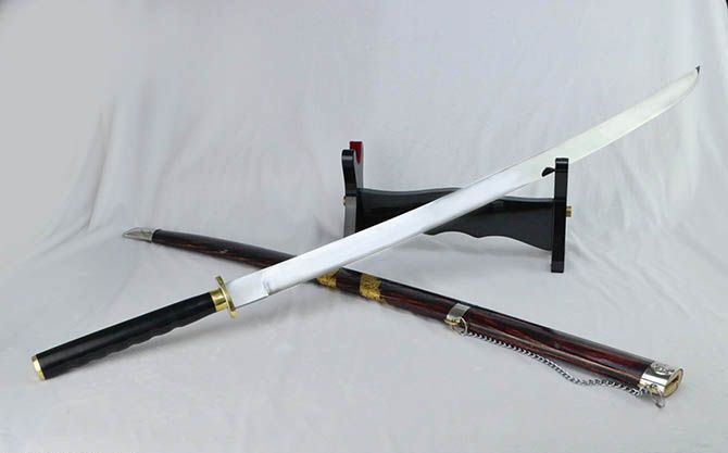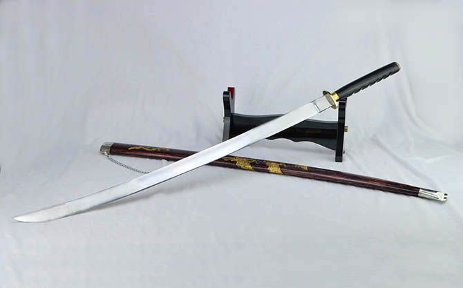 全长:105cm 刃长:81cm 刃宽:3.4cm 刃厚:0.76cm 刃材:45#钢 柄长: 24cm 重量:1450克(含鞘) 鞘材:木包铁 柄材:铜+黑牛角,一体龙骨结构 硬度区间:60HRC 性能:手工精细研磨全开锋,削纸断竹砍、削发如泥、锋利无比。 备注:本品不含刀架,手工产品存在误差,规格仅供参考,请以实物为准!