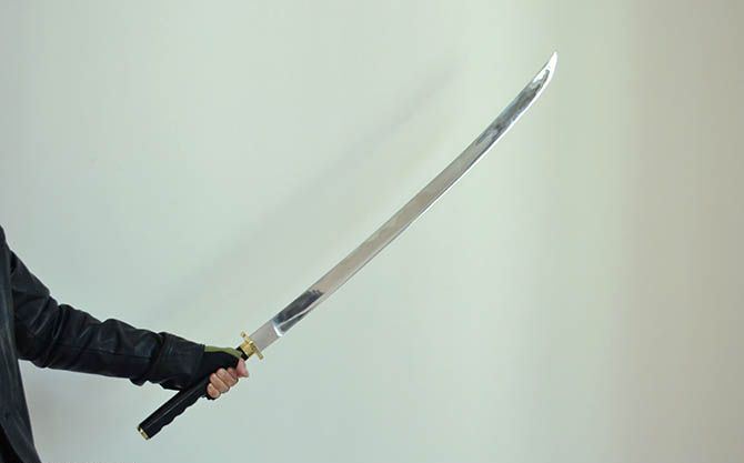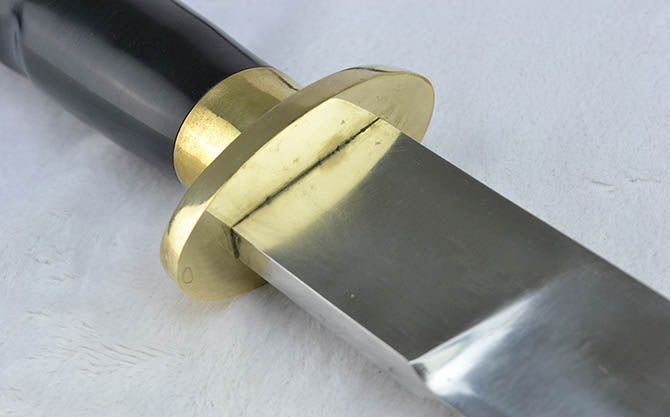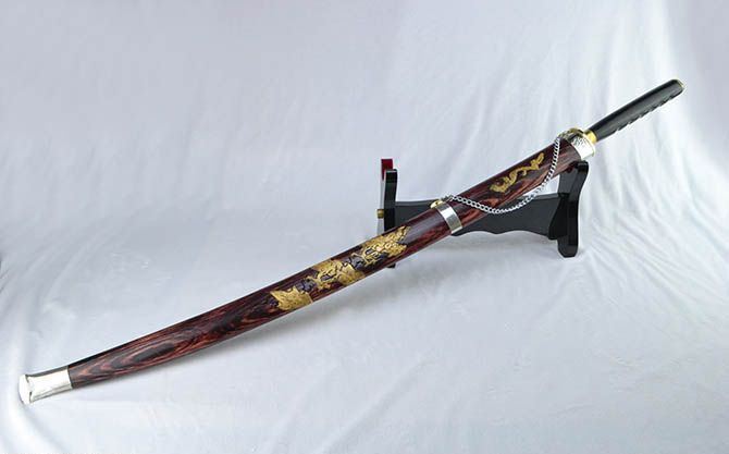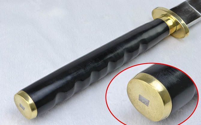 户撒龙壳落叶刀(超长80公分) 全长:105cm 刃长:81cm 刃宽:3.4cm 刃厚:0.76cm 刃材:45#钢 柄长: 24cm 重量:1450克(含鞘) 鞘材:木包铁 柄材:铜+黑牛角,一体龙骨结构 硬度区间:60HRC 性能:手工精细研磨全开锋,削纸断竹砍、削发如泥、锋利无比。 备注:本品不含刀架,手工产品存在误差,规格仅供参考,请以实物为准!